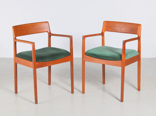 A pair of Danish Mid Century teak carver dining chairs by Johannes Nørgaard for the Nørgaards Møbelfabrik, circa 1960s.