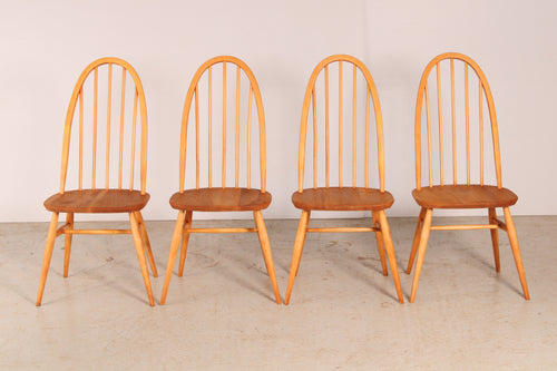 Set of 4 Mid Century blue label Ercol Quaker elm dining chairs, circa 1960s.
