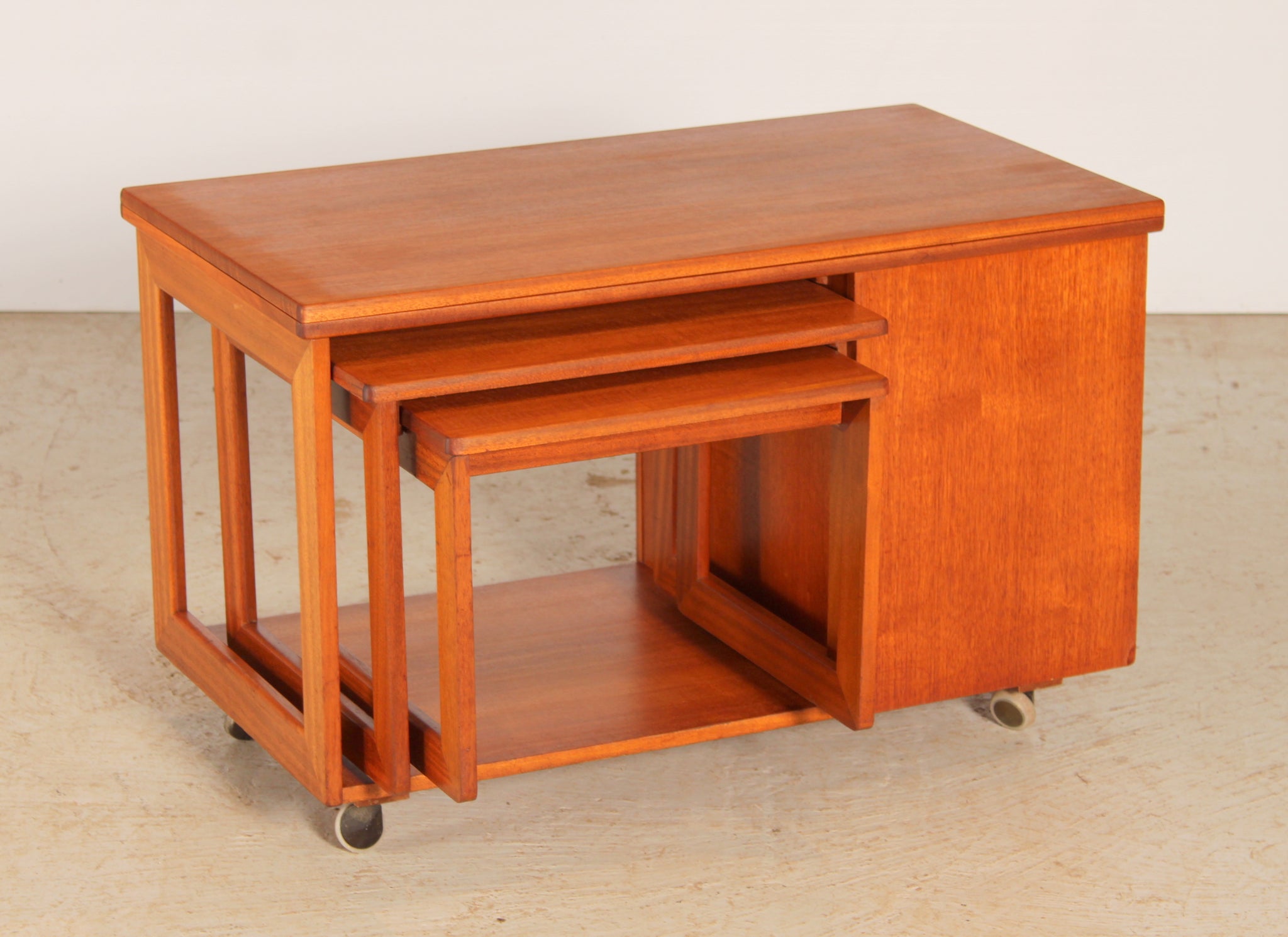 A mid century Tristor teak nest of tables by McIntosh, circa 1970s. The table can be rotated and unfolded and features two nesting tables and a storage compartment at one end.