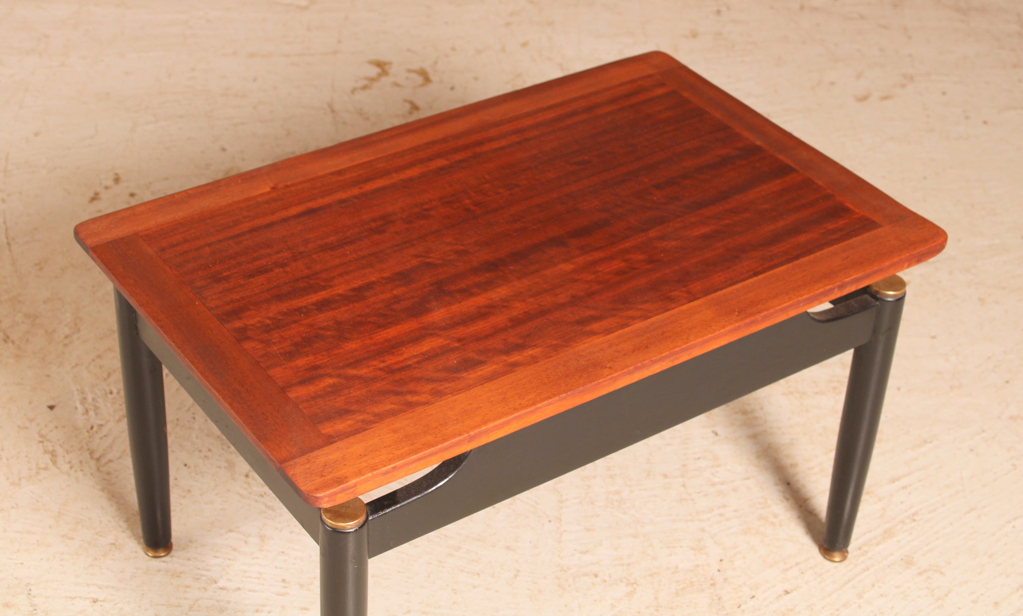 A midcentury G Plan Librenza coffee table, circa 1960s. The coffee table has a teak top, black legs and brass feet. £225