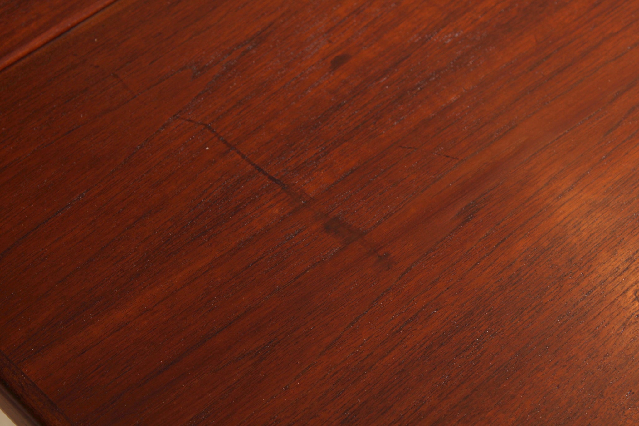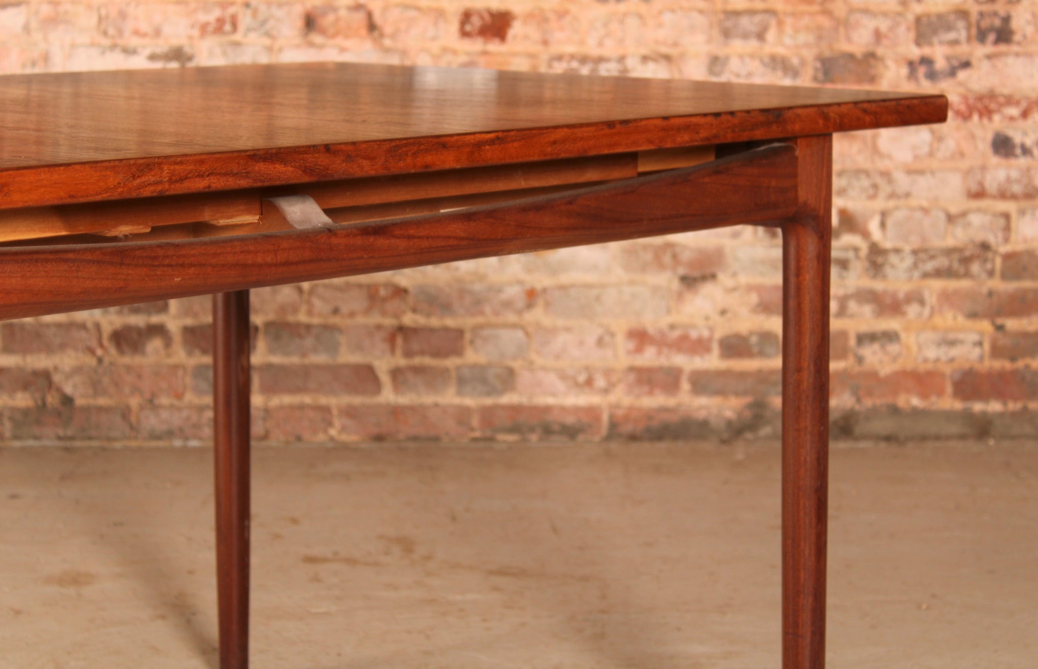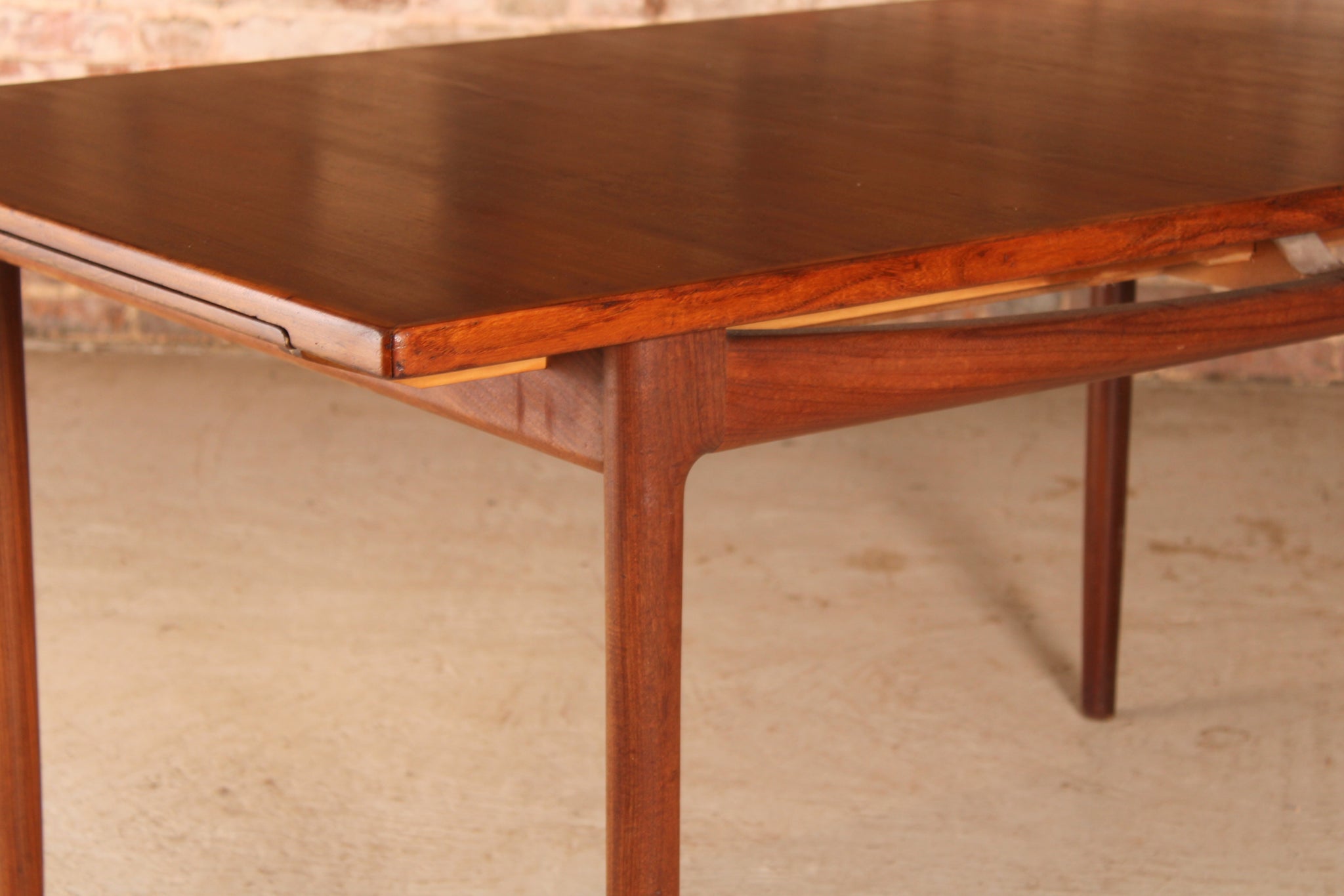 A midcentury teak dining table designed by Ib Kofod Larsen for G Plan, circa 1960s. The rectangular top features two extension leaves that store neatly beneath the surface, allowing the table to extend to accommodate up to ten people. Tapered legs and a sculpted apron contribute to its refined profile, while the rich teak grain enhances its warm appearance. Fully restored but signs of use remain as seen in photos.