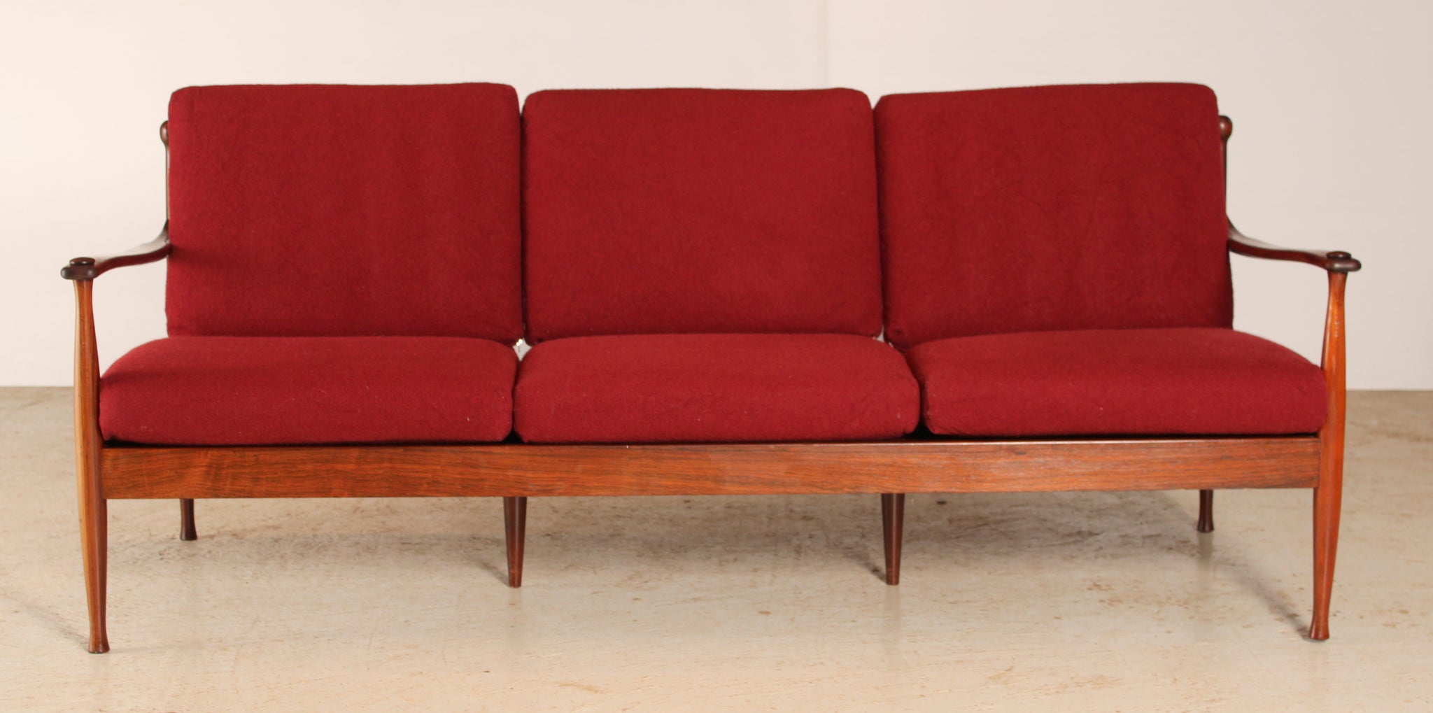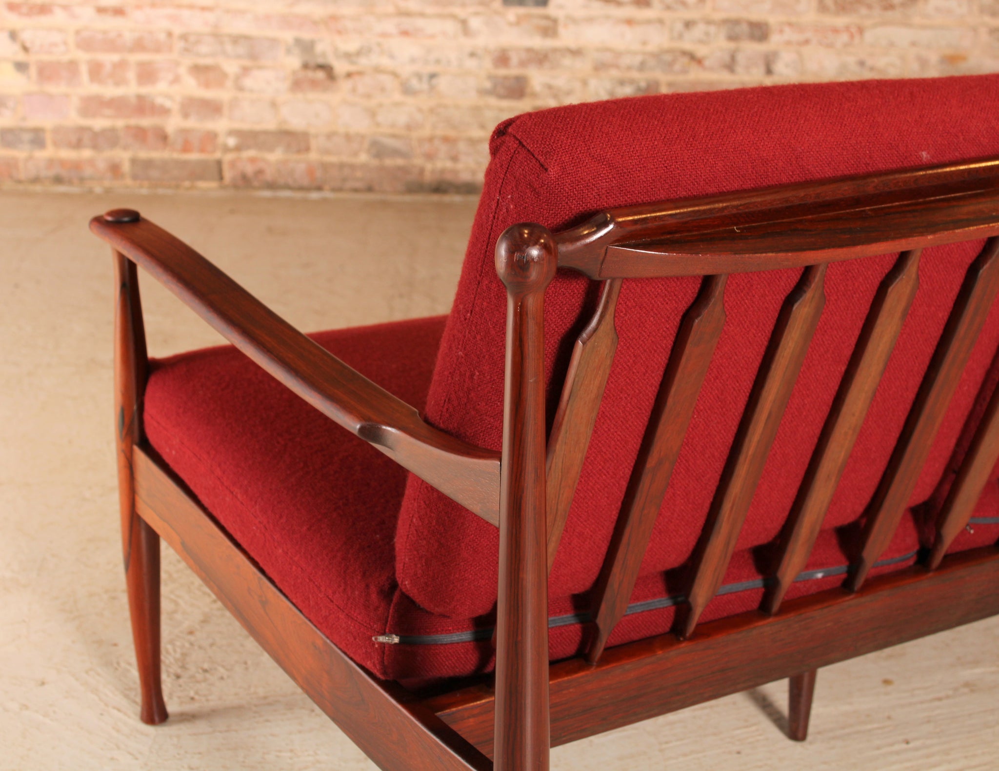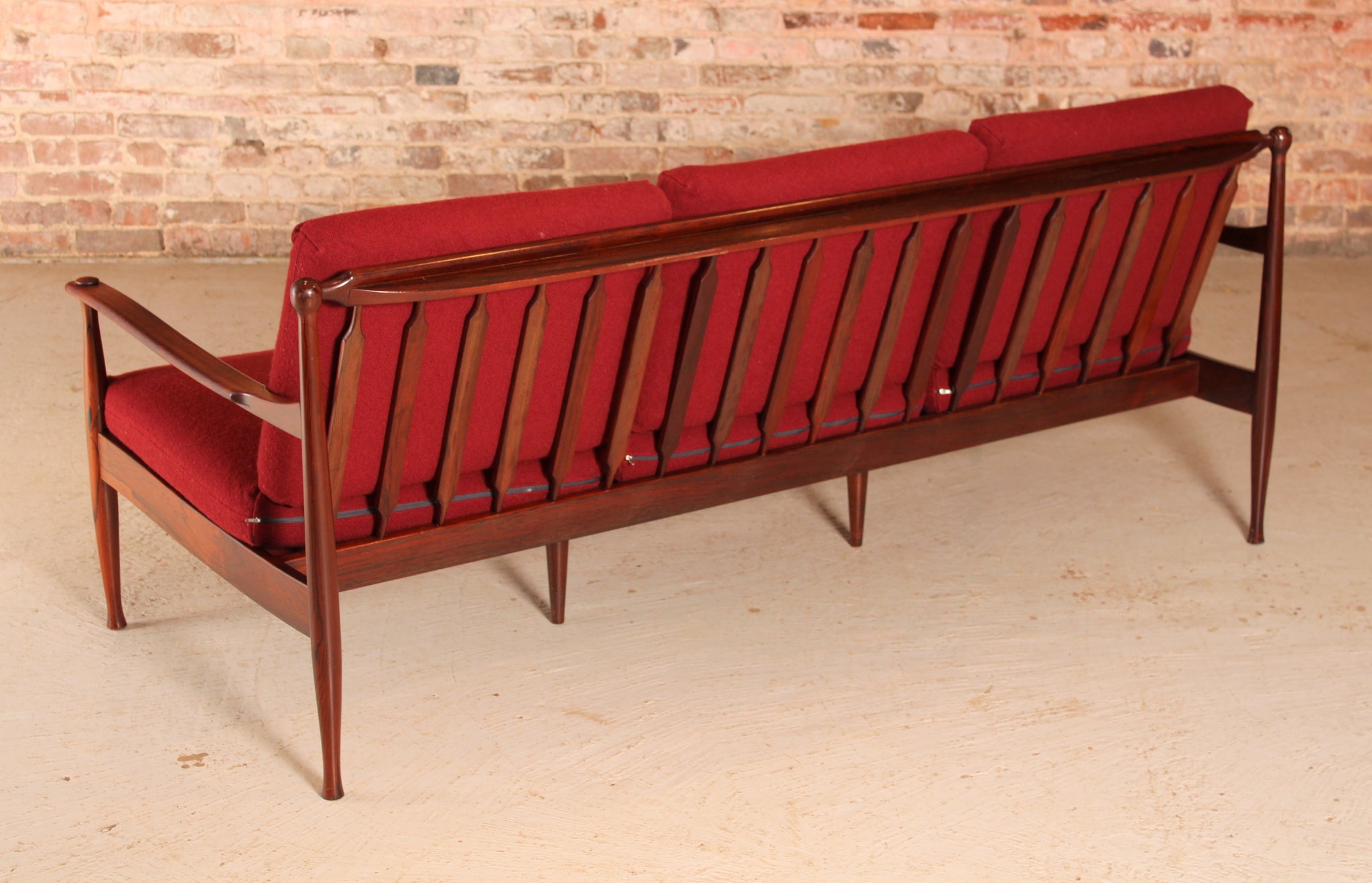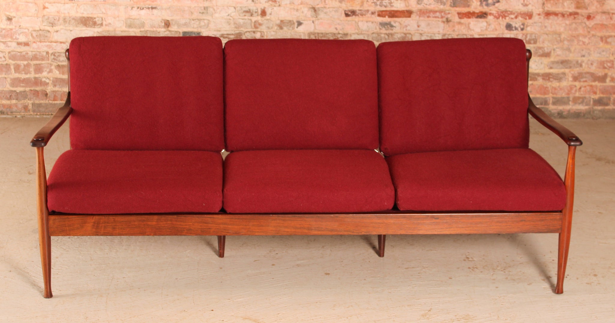 This 3-seater Danish Mid Century sofa, crafted from rosewood and upholstered in red wool, dates from the 1960s. The frame has been professionally repolished, and the fabric is intact with no stains, rips, or tears. It remains in very good condition overall.