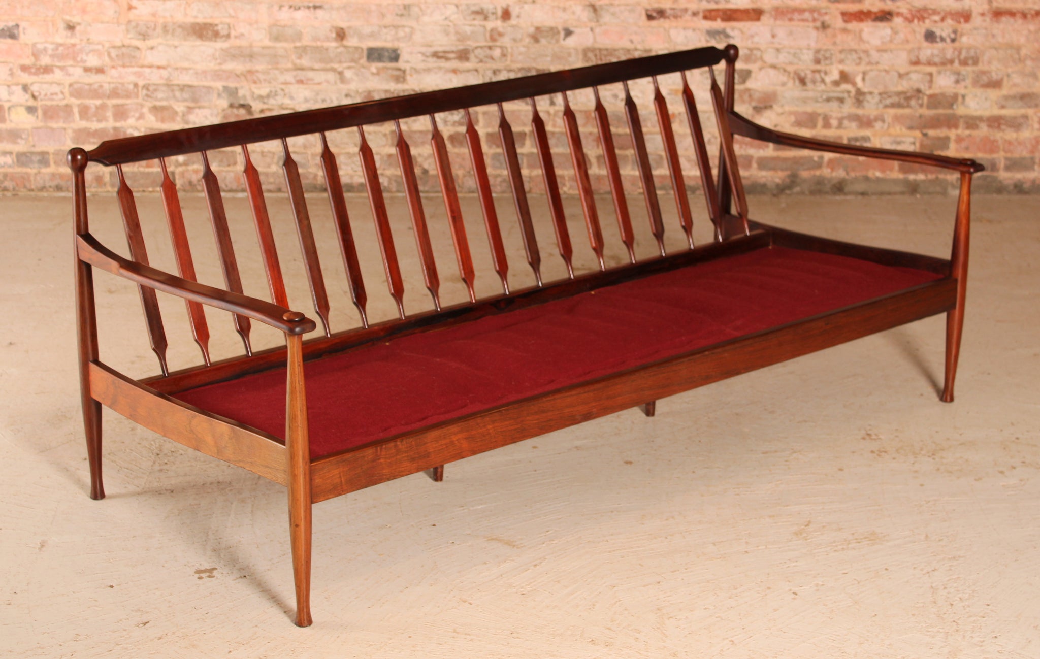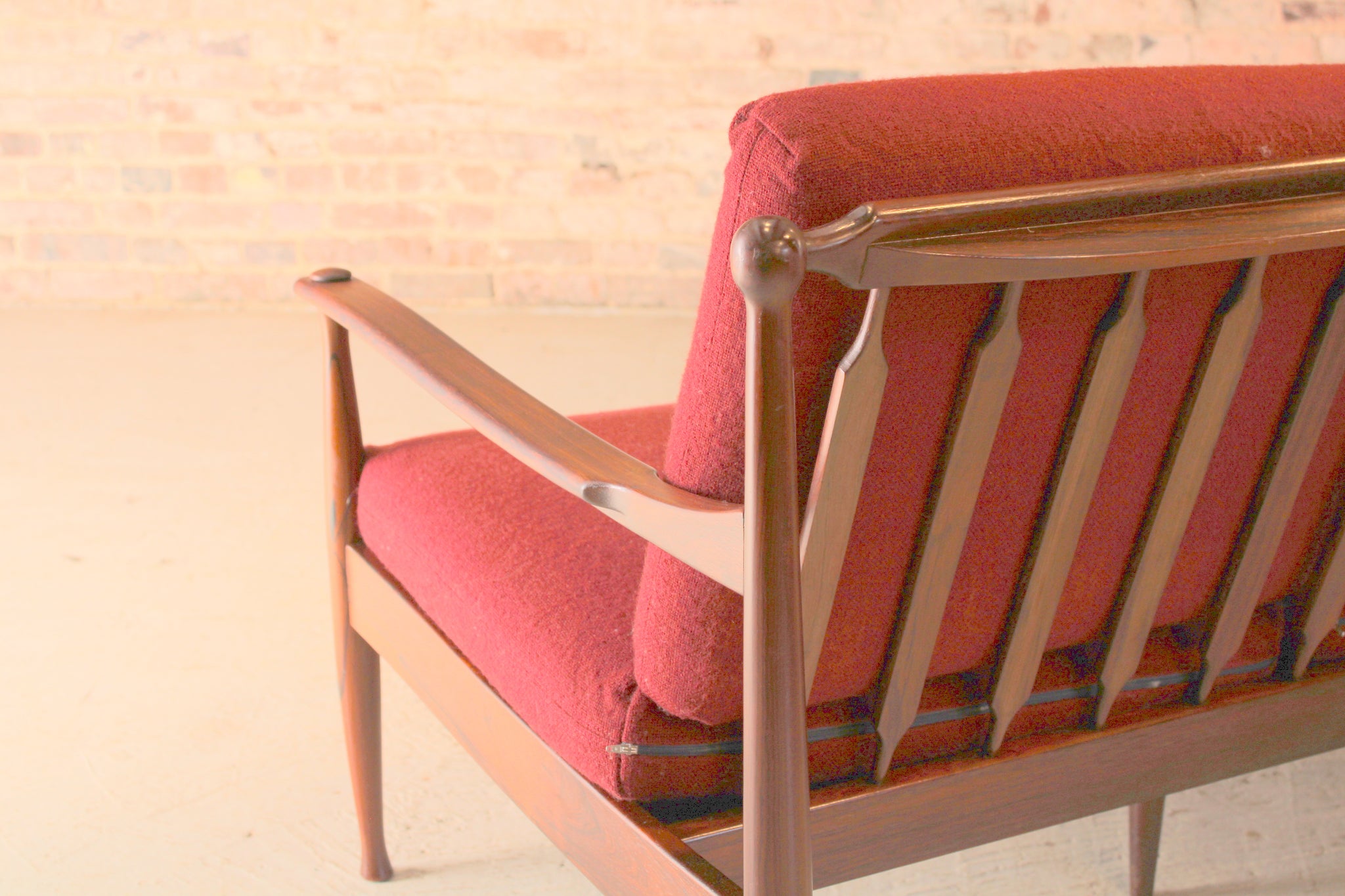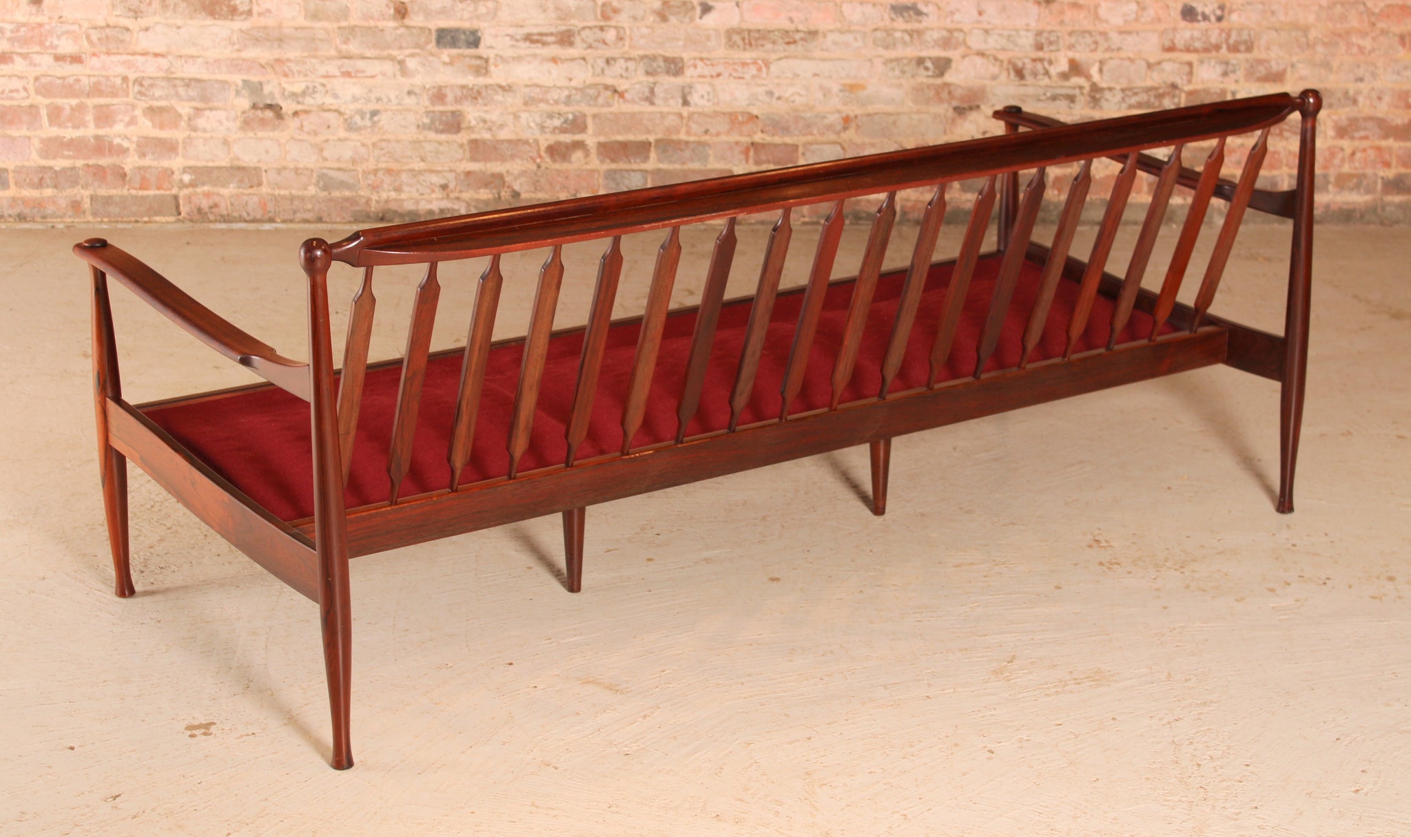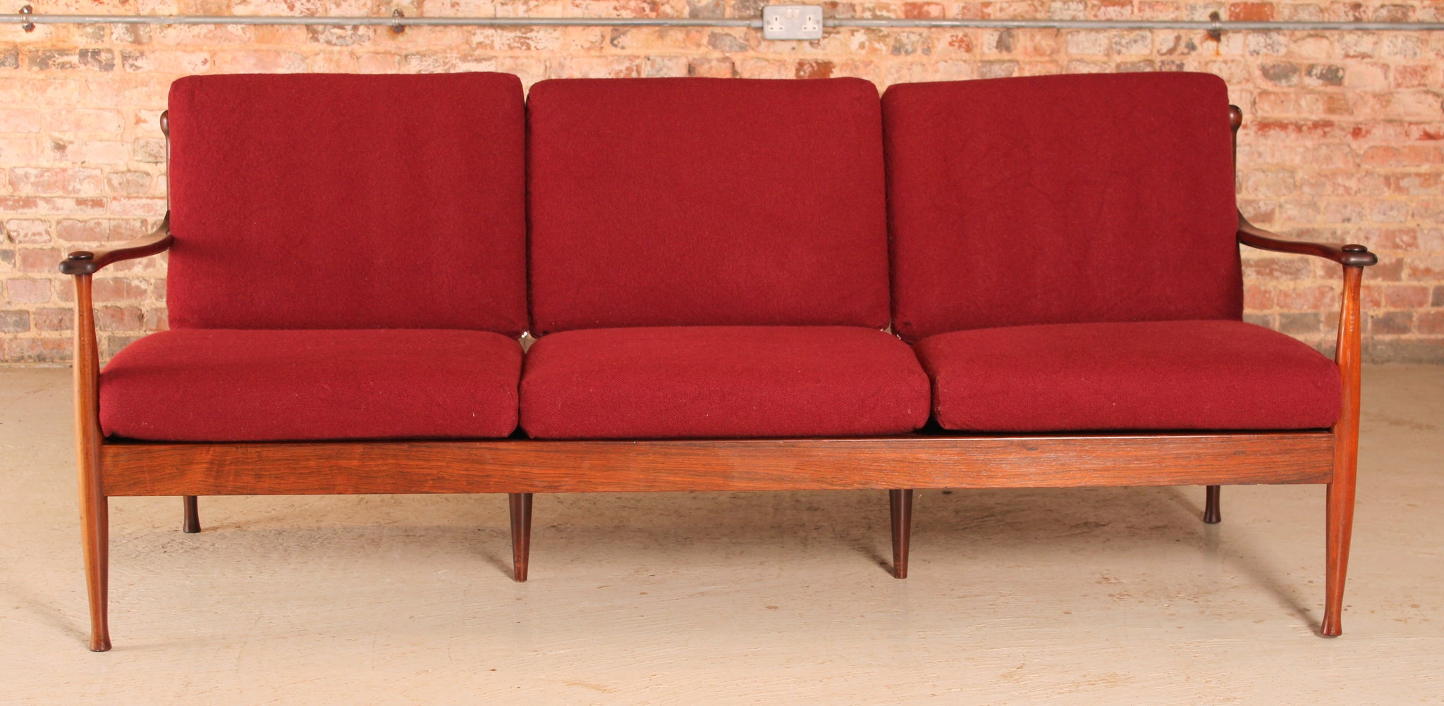 This 3-seater Danish Mid Century sofa, crafted from rosewood and upholstered in red wool, dates from the 1960s. The frame has been professionally repolished, and the fabric is intact with no stains, rips, or tears. It remains in very good condition overall.