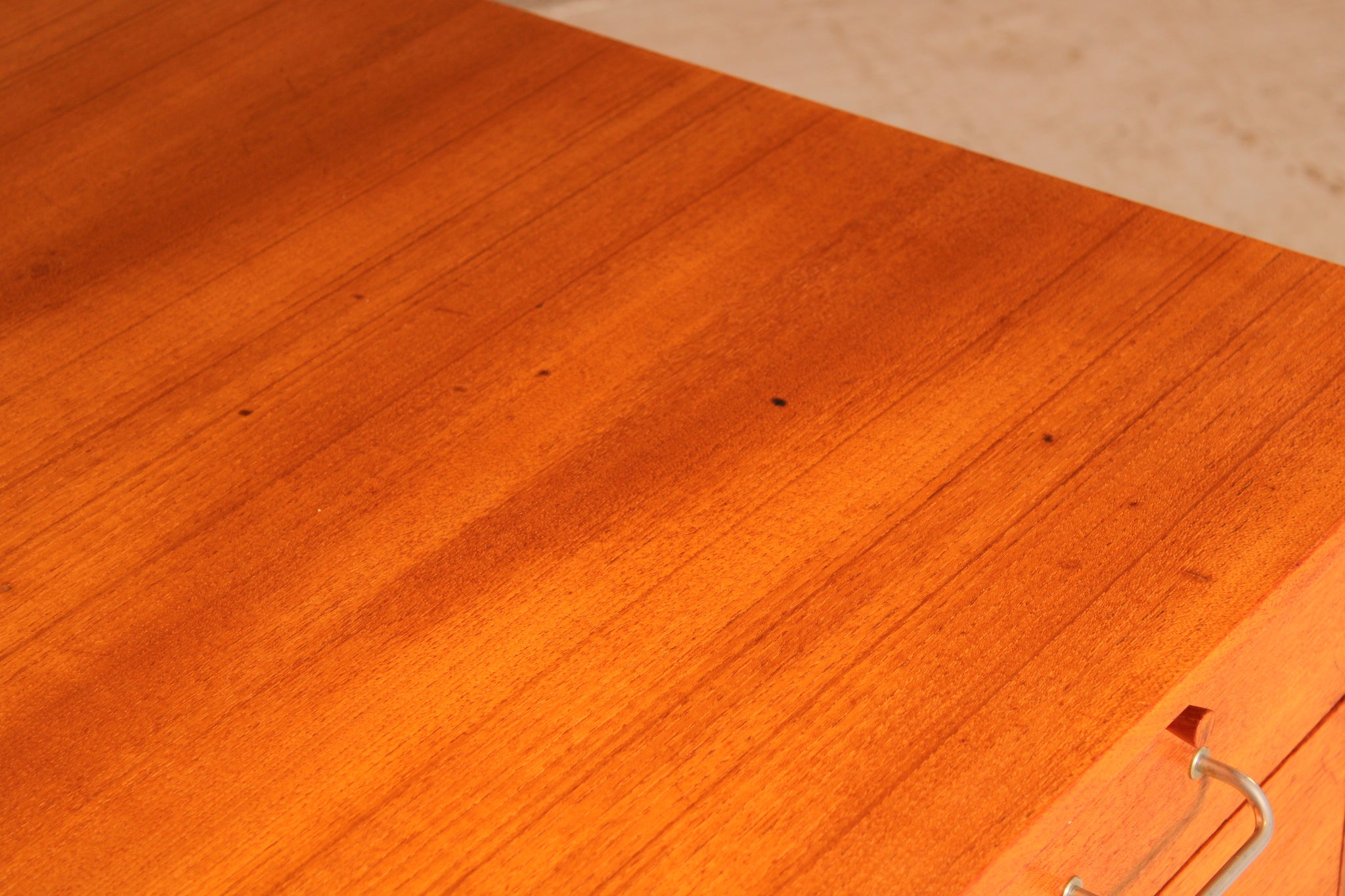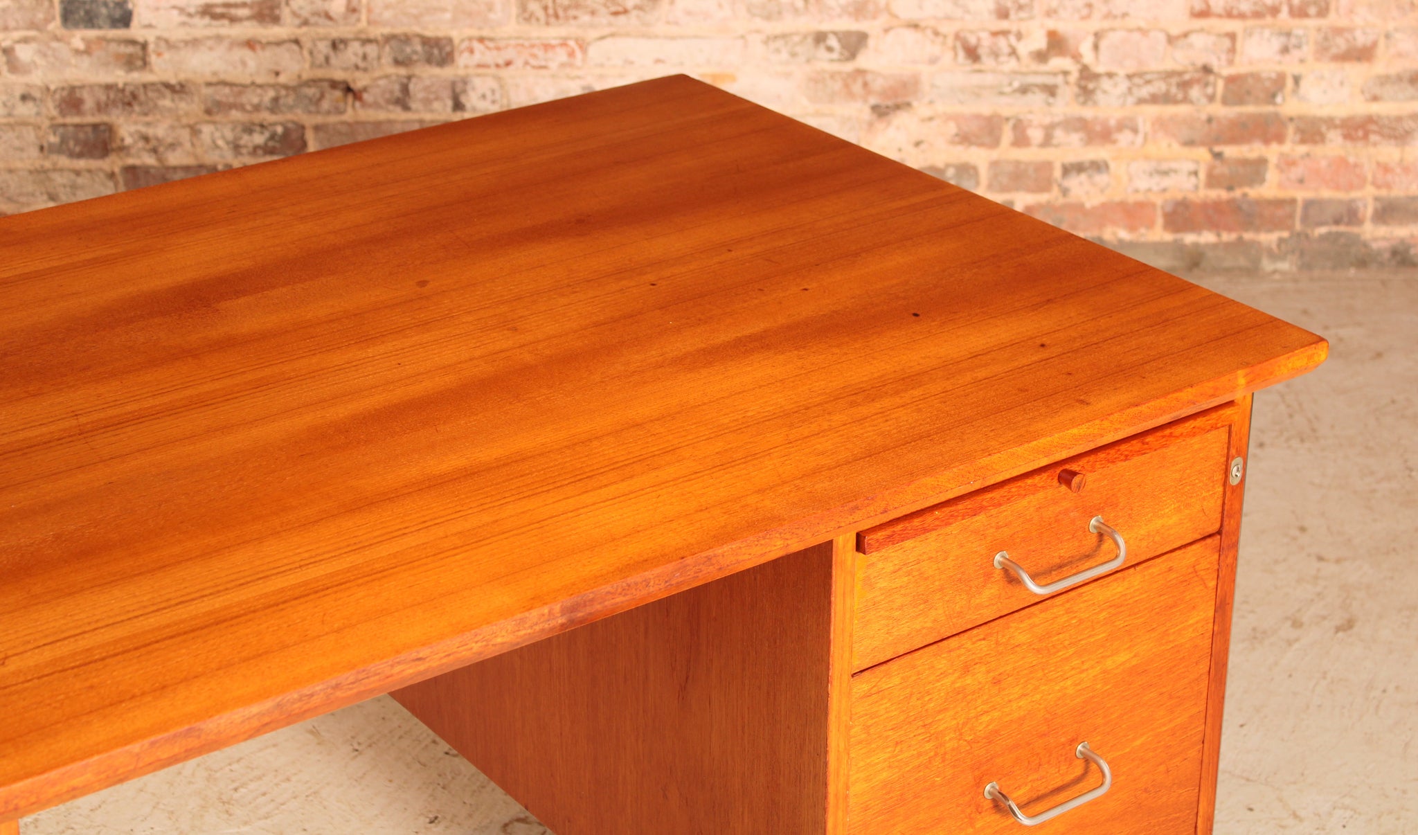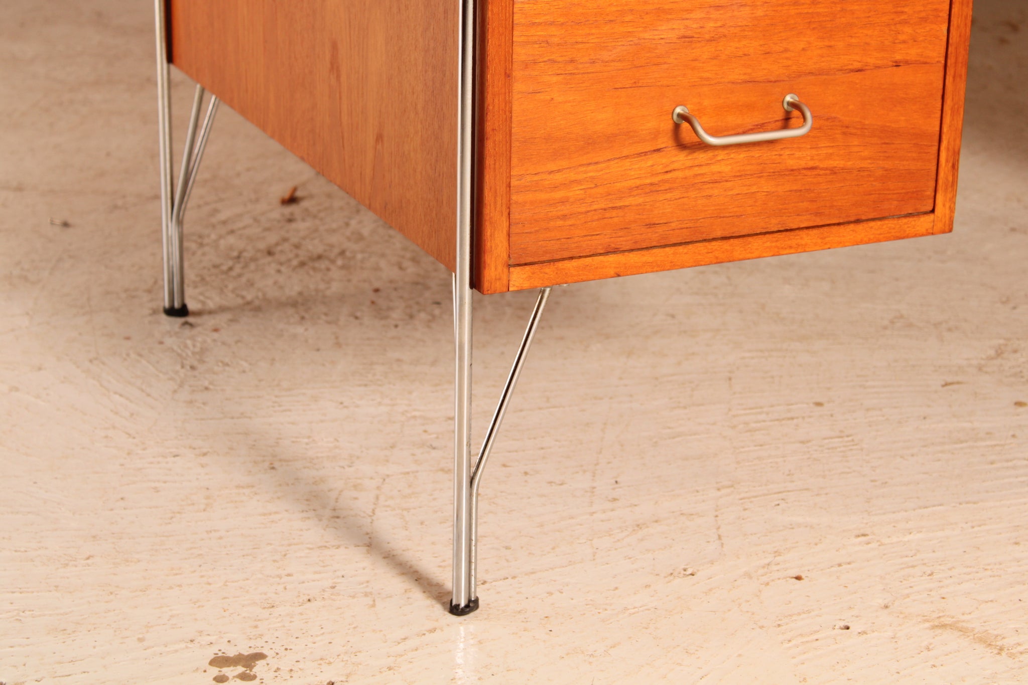Danish Mid Century teak desk with chrome legs designed by Heinrich Roepstorff, circa 1960s. Five drawers including a filing drawer. Three keys. Some minor marks on top.