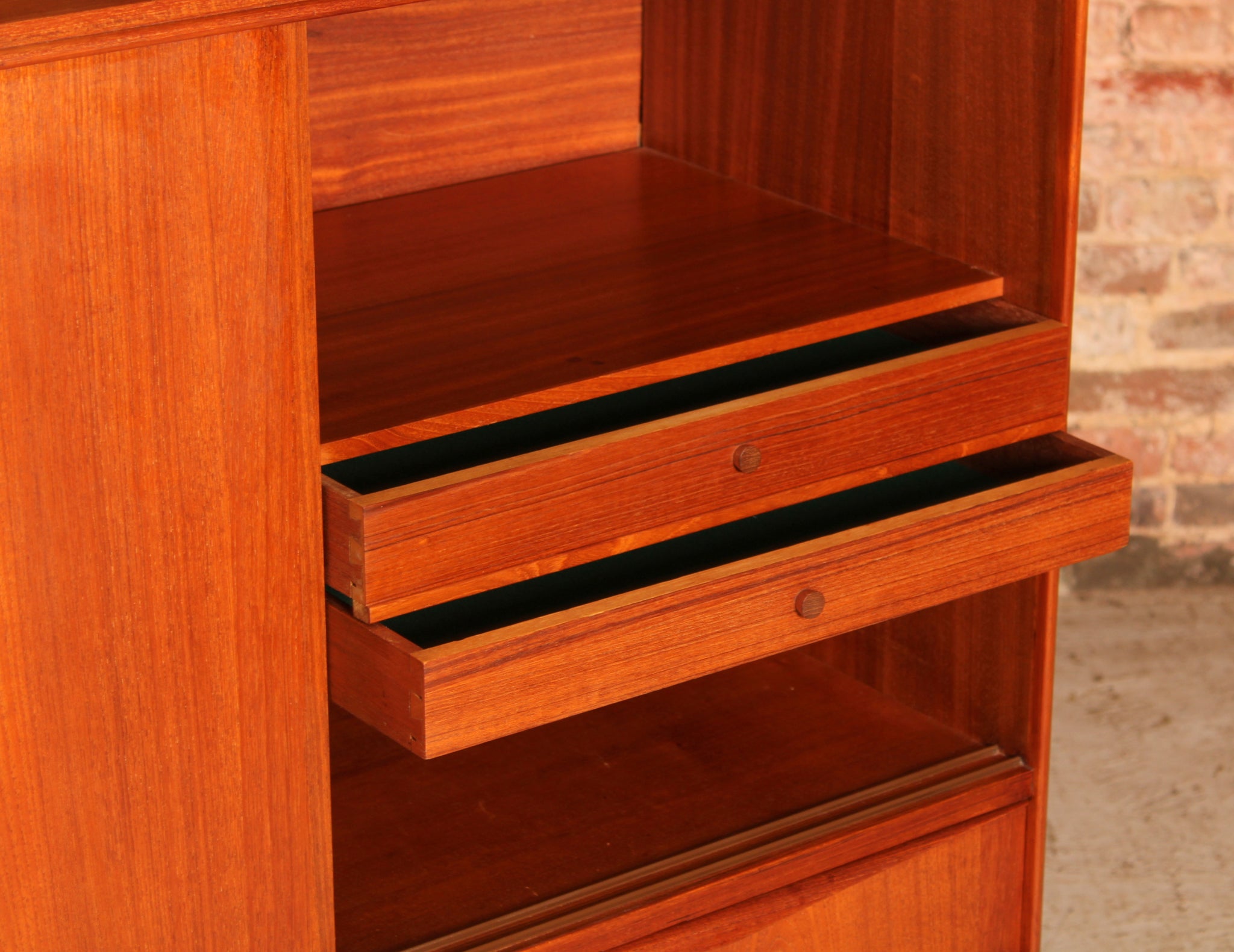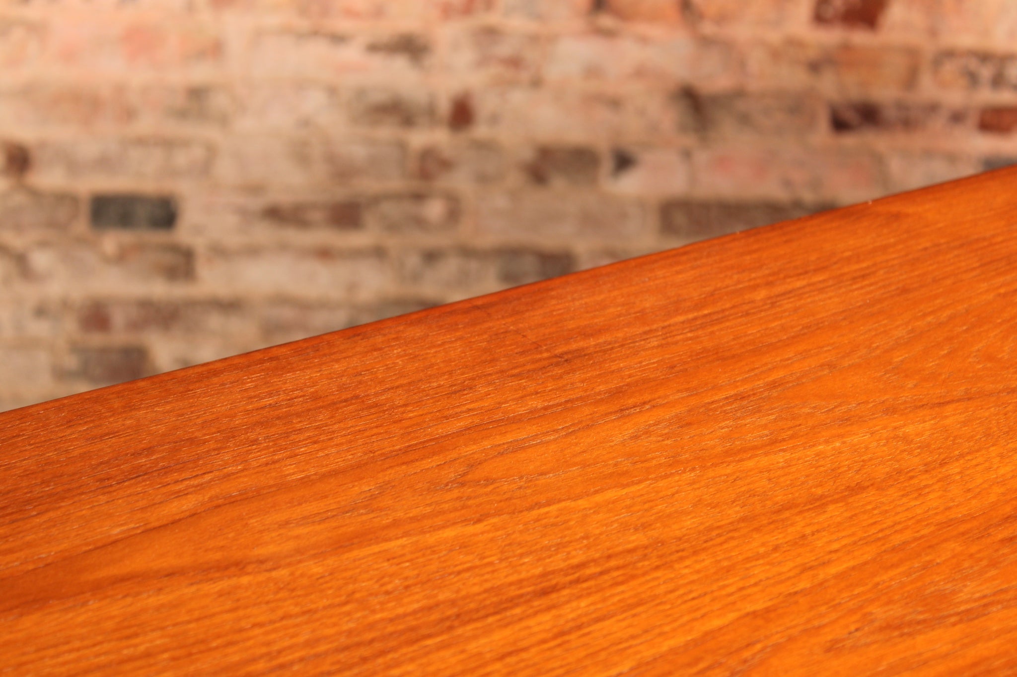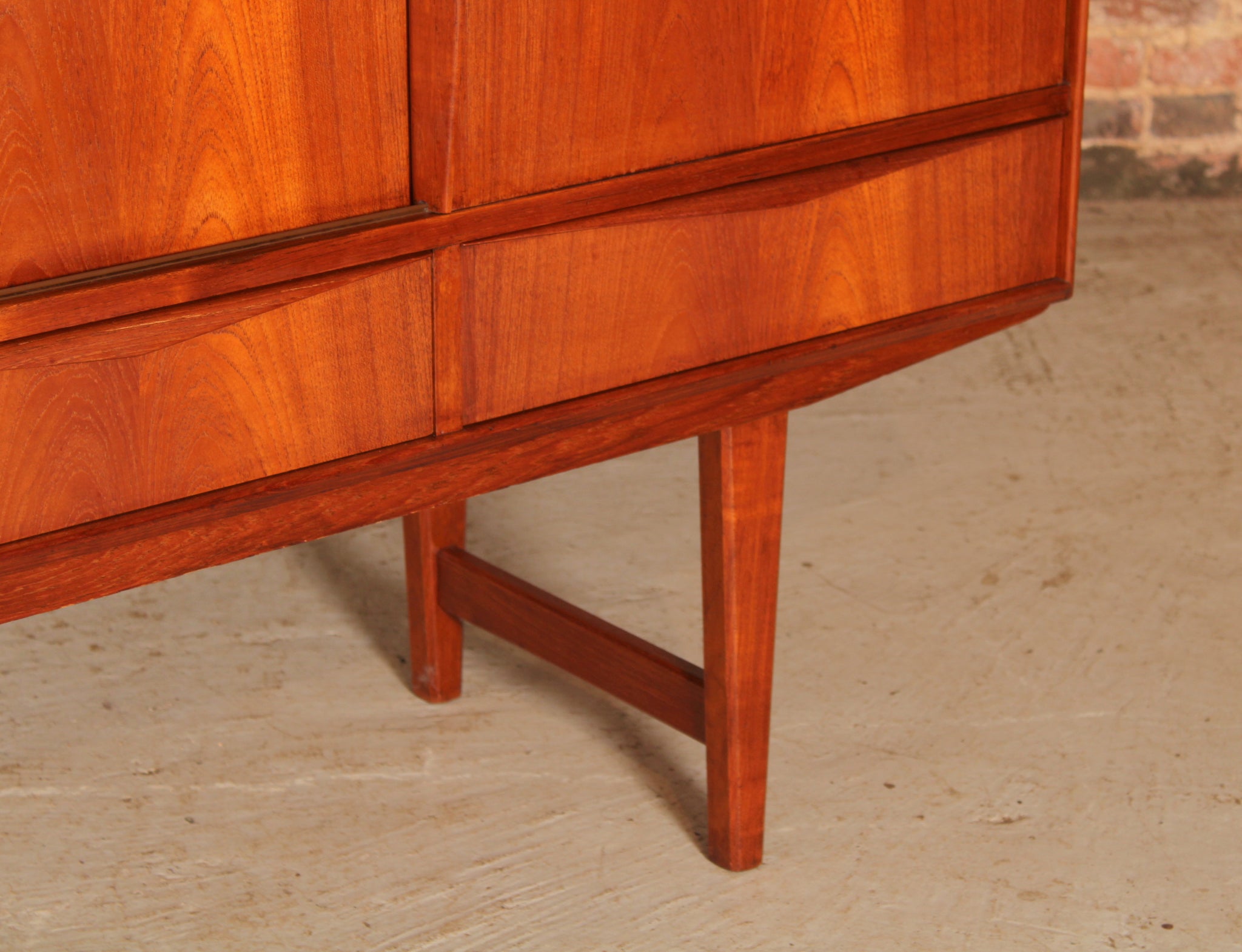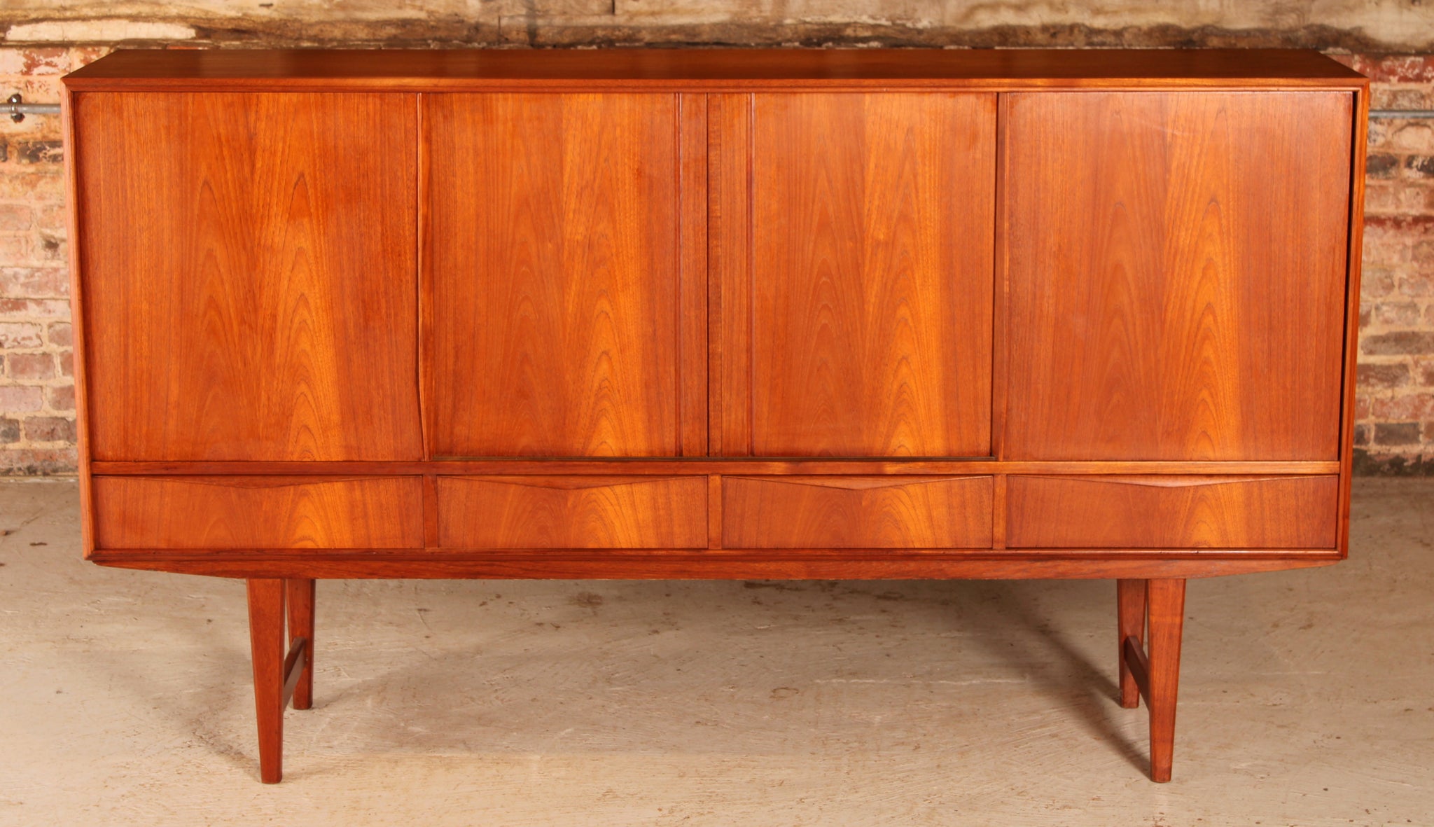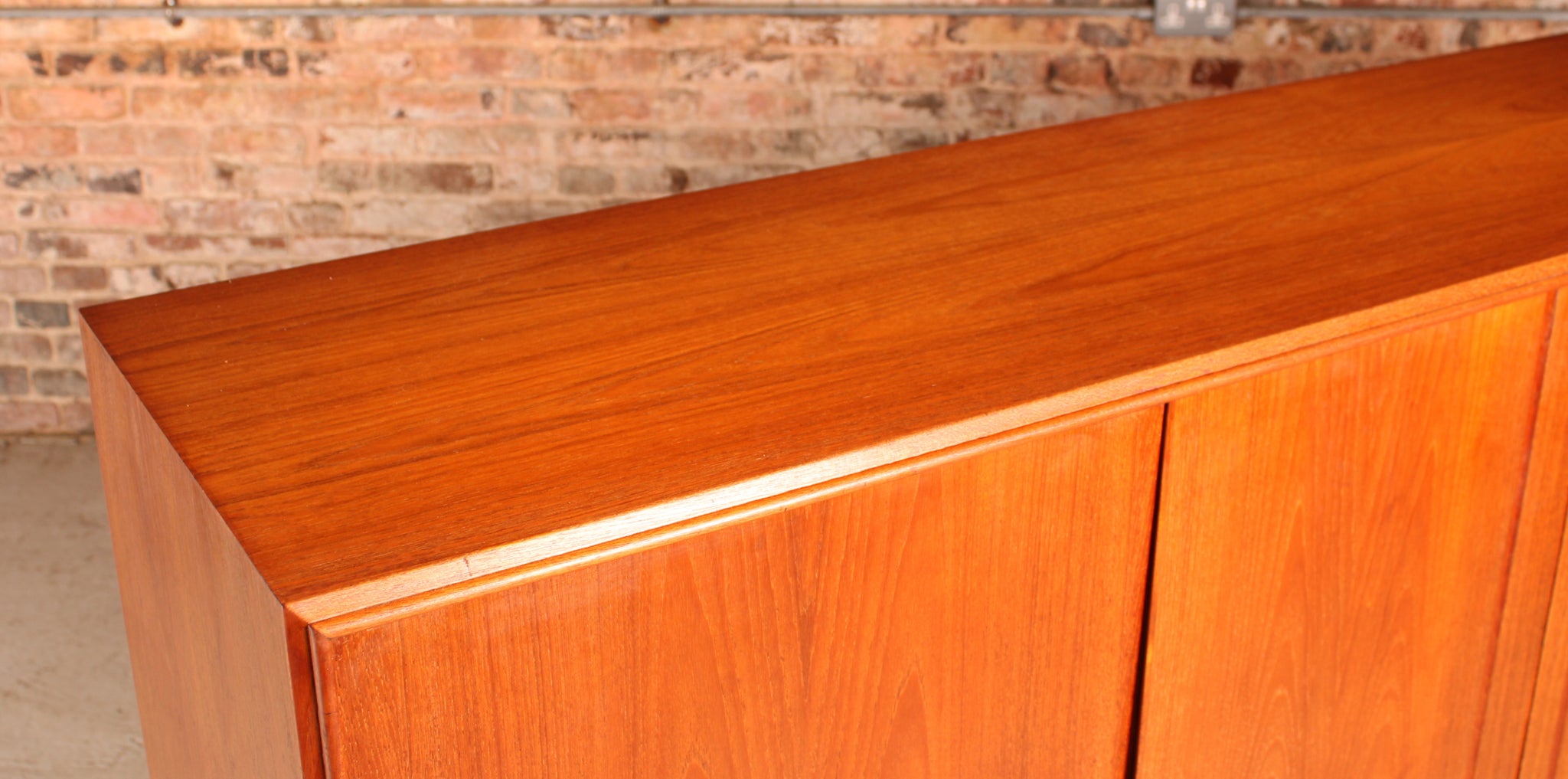This striking teak highboard exemplifies the refined craftsmanship of 1960s Danish modernism, designed by the accomplished E.W. Bach. The piece features four elegantly sliding cupboard doors paired with four substantial drawers, each adorned with meticulously carved handles that showcase period detailing. Two of the interior drawers are lined with felt, providing protective storage for delicate items. The furniture has undergone expert restoration, presenting in excellent condition that honours its original design integrity whilst ensuring longevity for contemporary interiors.