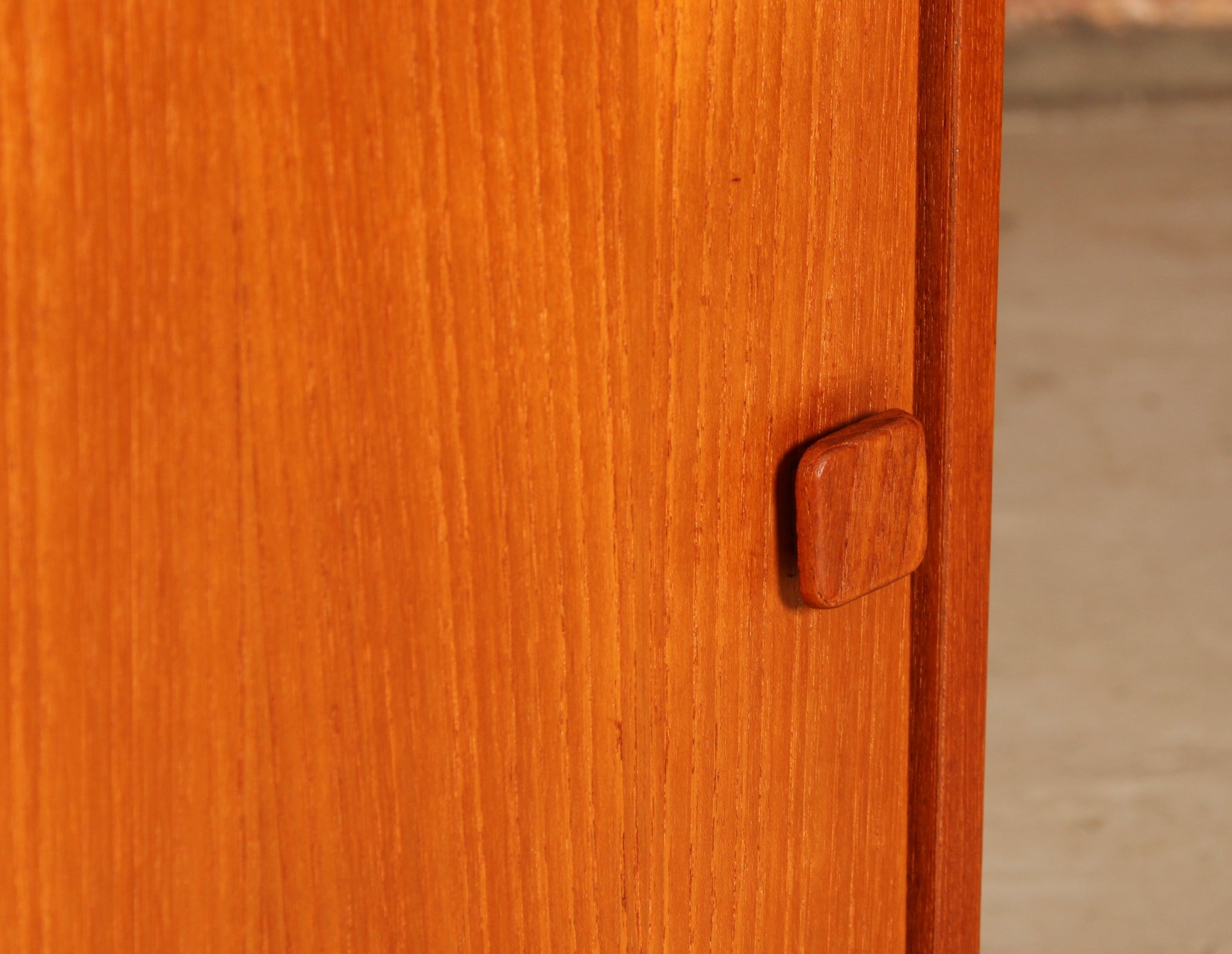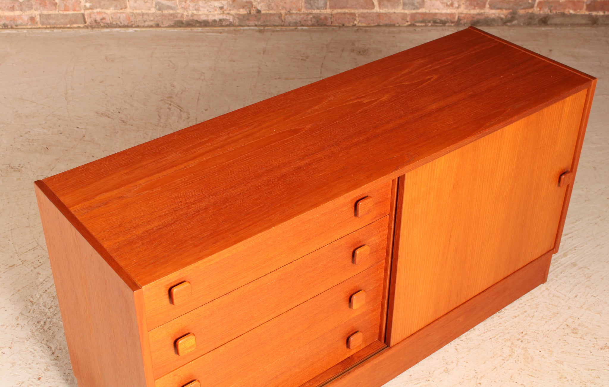Danish Mid Century teak sideboard by Domino Mobler, circa 1970s. 4 drawers and a cabinet section with a sliding door. Excellent restored condition.