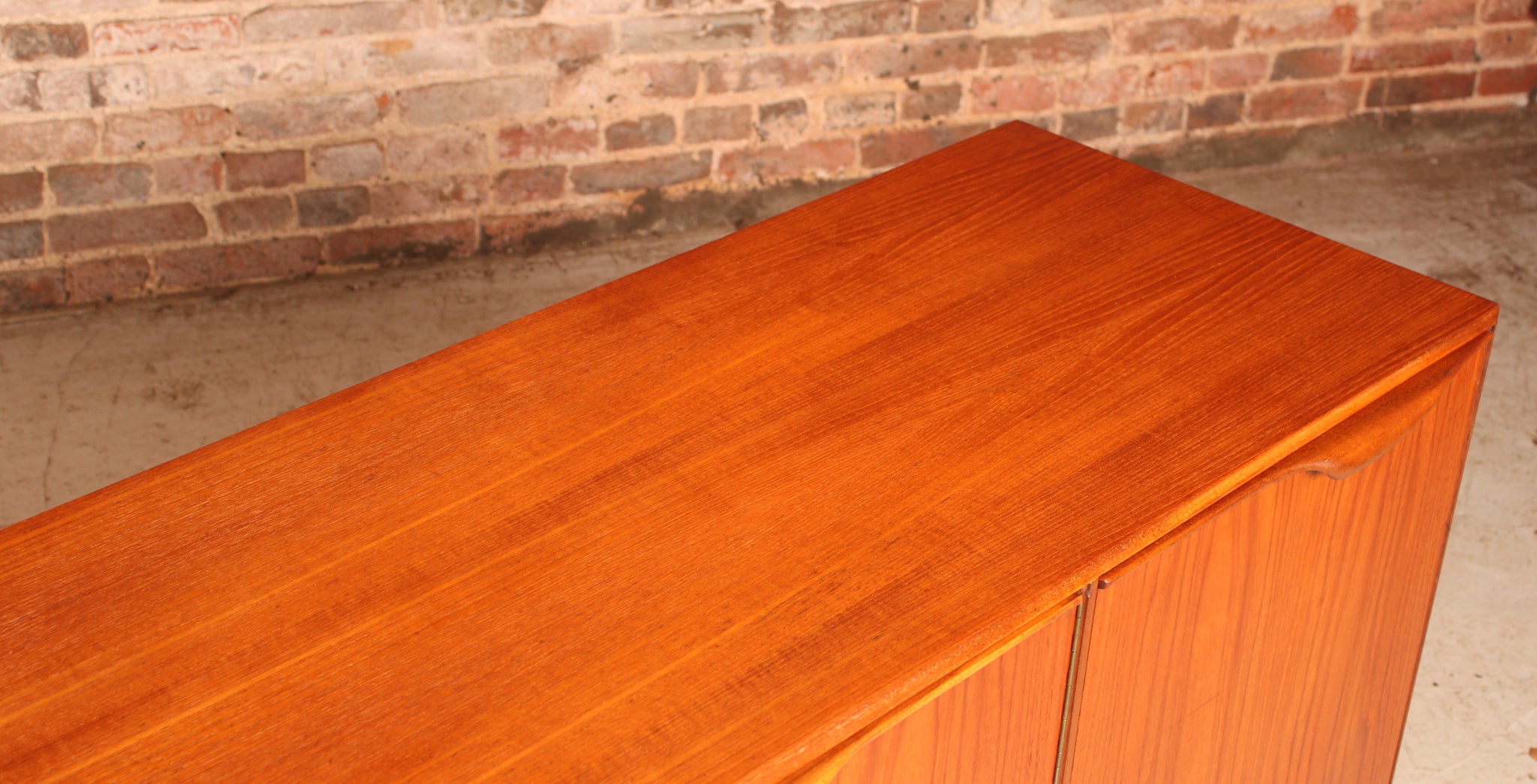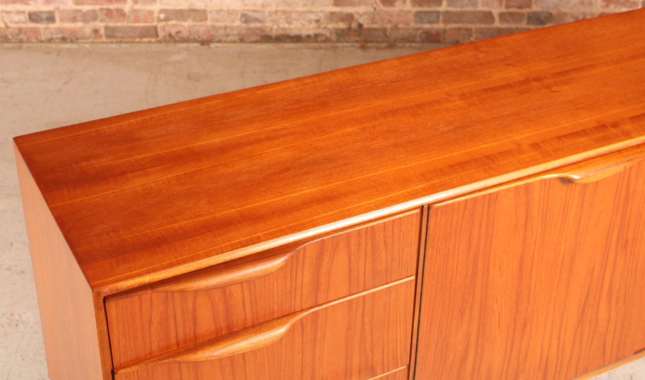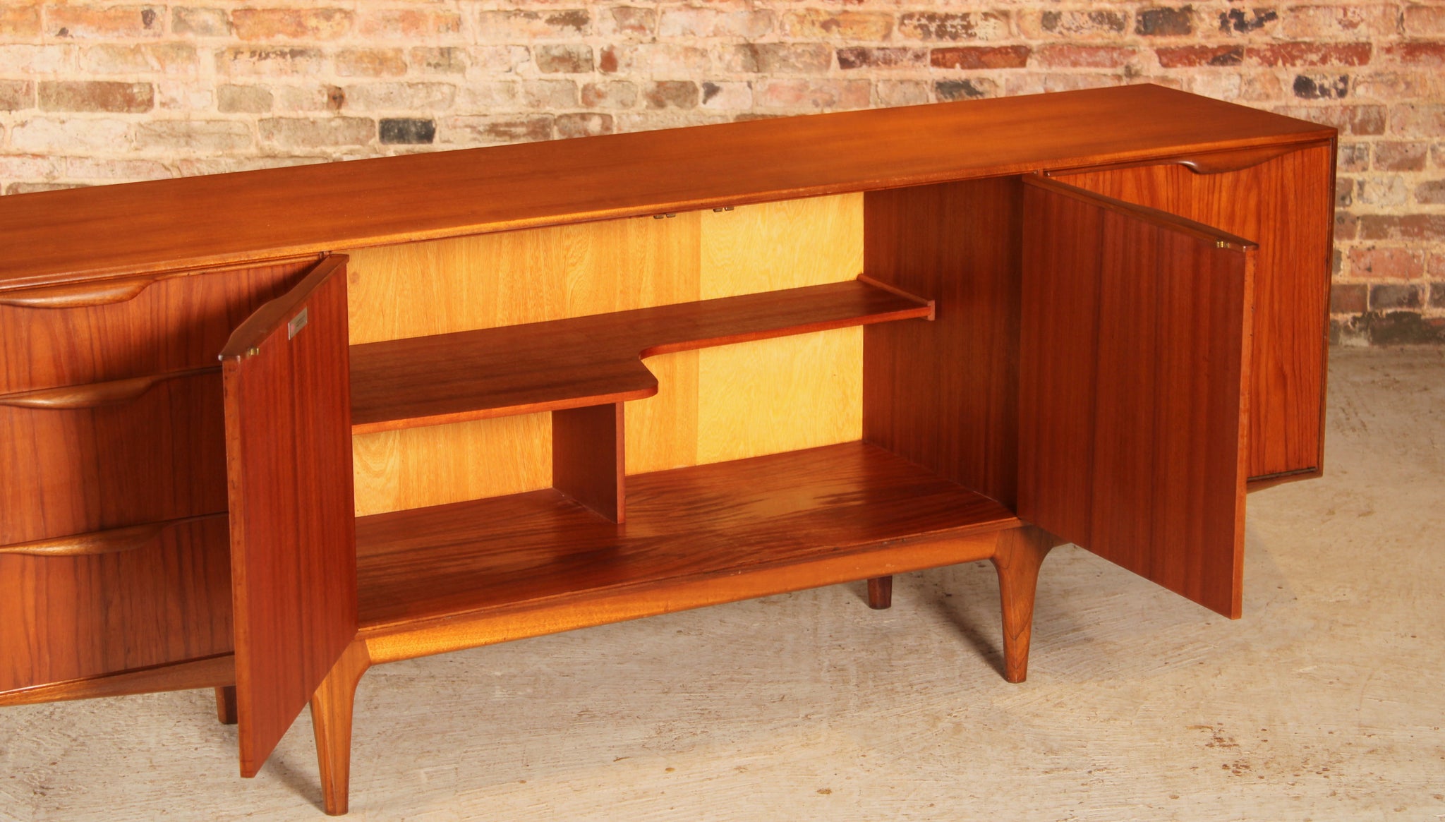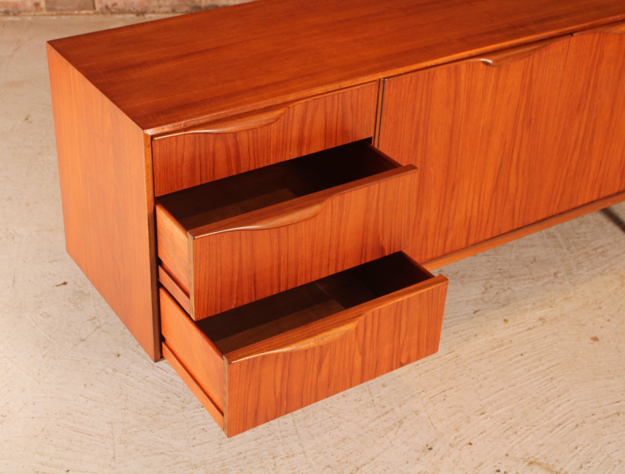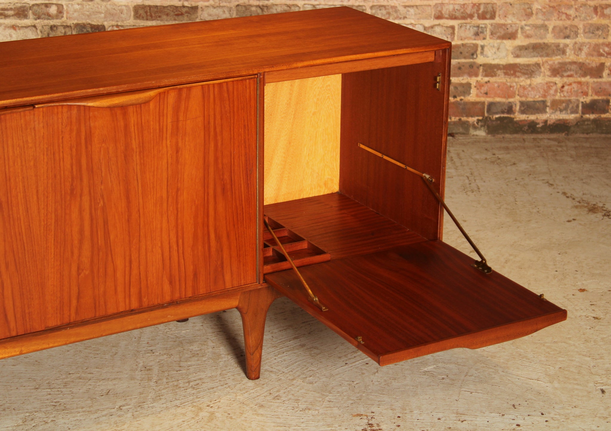 A Mid Century Dunvegan teak sideboard designed by Tom Robertson and manufactured by A.H. McIntosh of Kirkcaldy, Scotland, circa 1960s. Three drawers, central cupboard doors and drop door section with pull-out tray and bottle tray. Excellent restored condition.