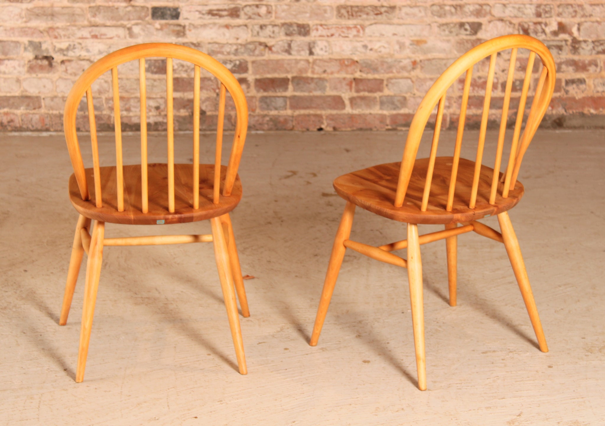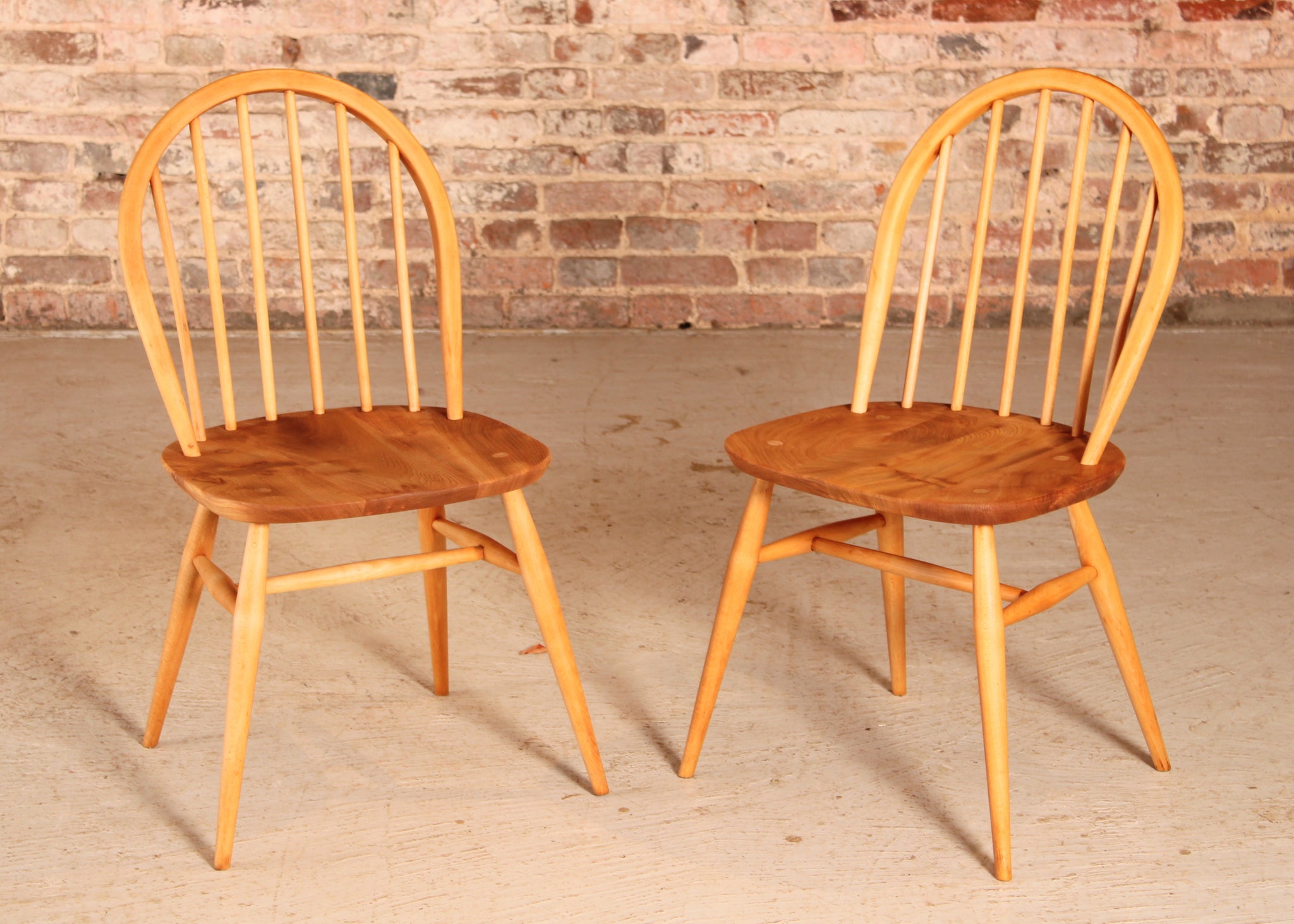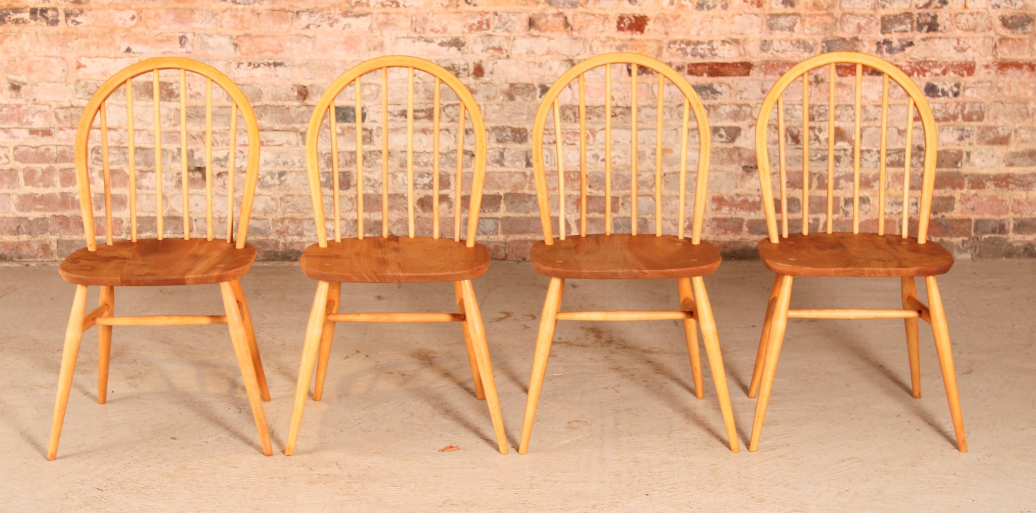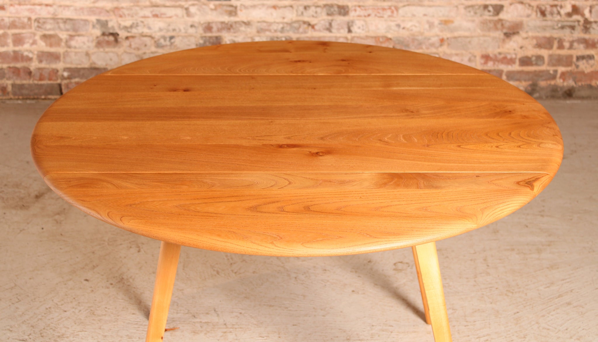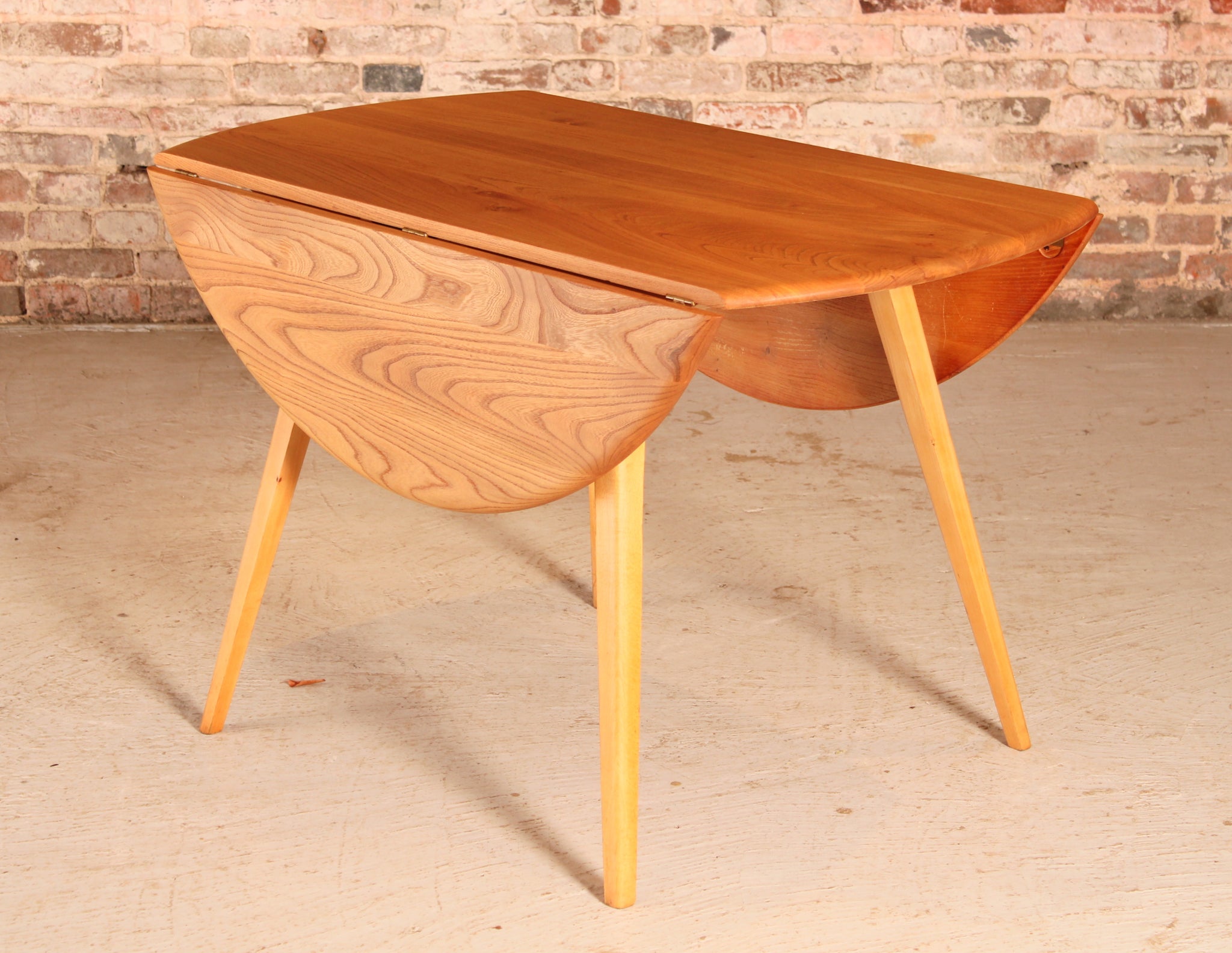 Mid Century Ercol dining set, circa 1960s. Set of 4 model 370 elm and beech chairs and model 384 drop leaf dining table. Blue Ercol labels on chairs. Excellent fully restored condition.