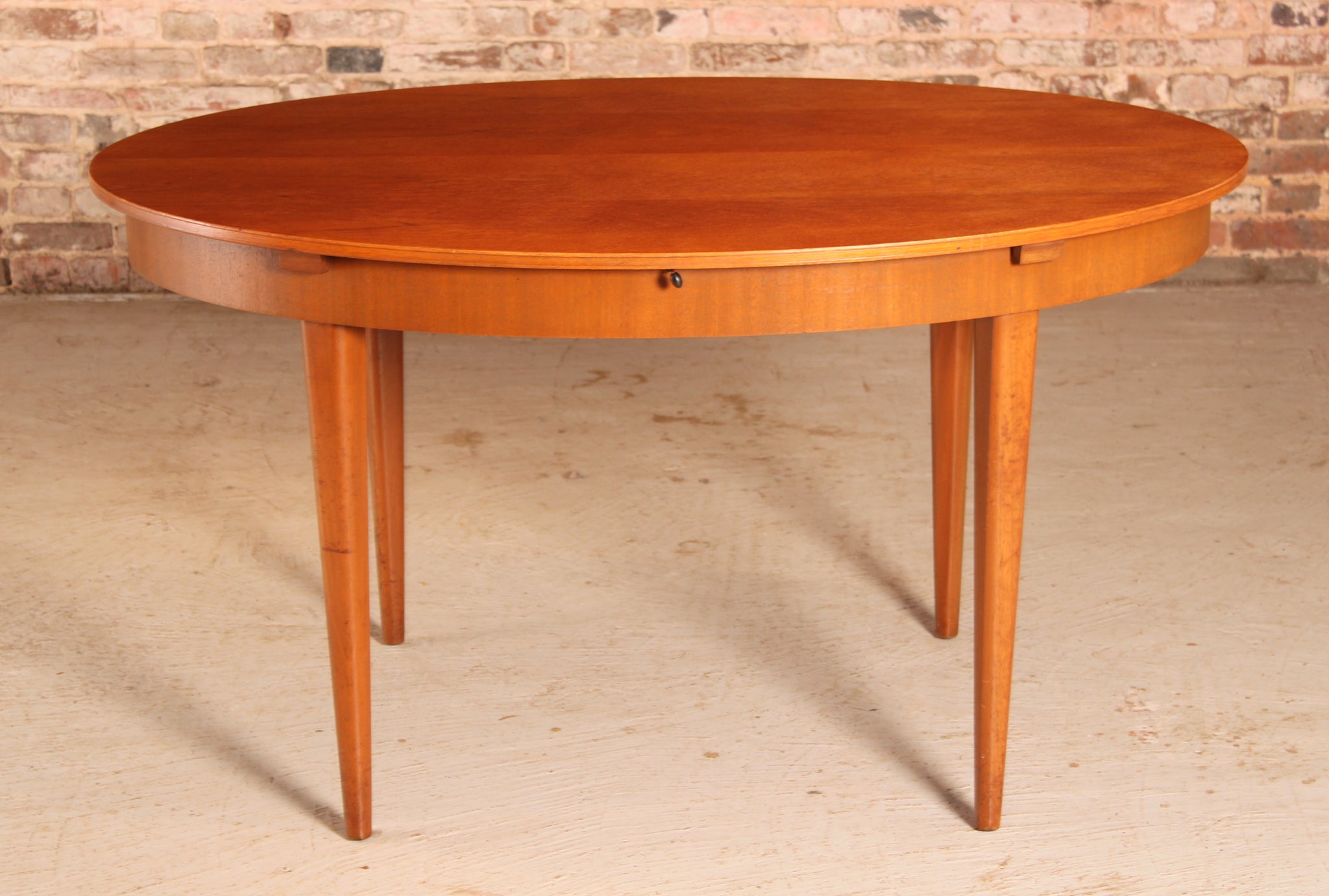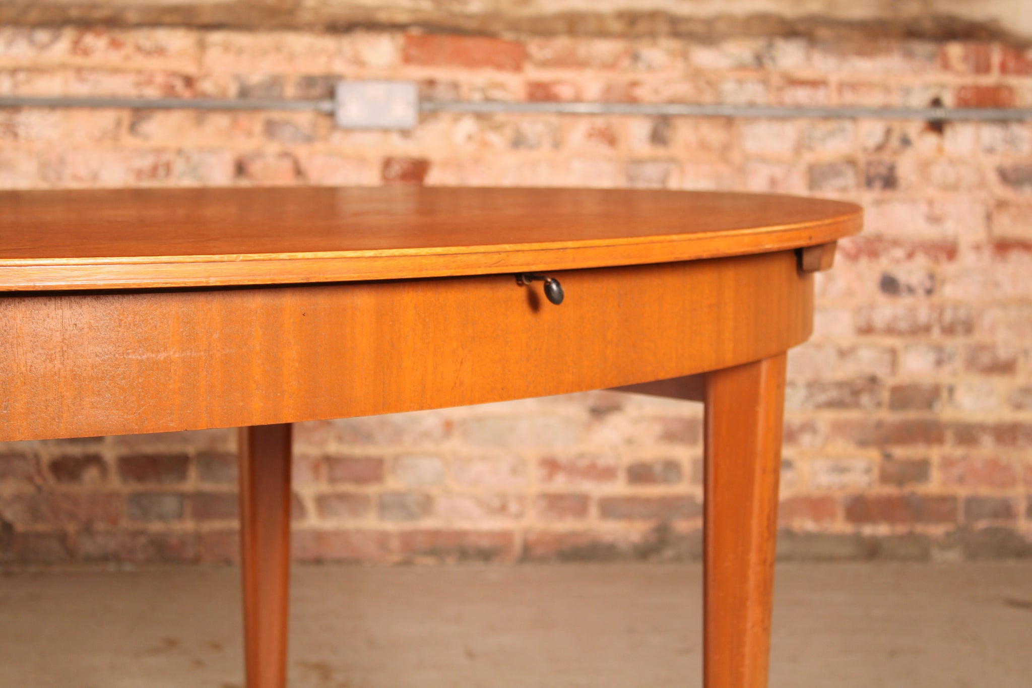This exquisite Mid Century extending teak dining table by Greaves & Thomas, dating from the 1960s, exemplifies timeless craftsmanship and elegant design. Featuring a butterfly extension leaf discreetly stored underneath, it offers versatile dining space to accommodate guests with ease. Expertly restored to excellent condition, the table retains its rich teak finish and clean lines, making it a charismatic focal point for any interior. Its blend of functionality and vintage charm ensures it remains a practical yet stylish addition to contemporary dining rooms or collectors’ spaces.