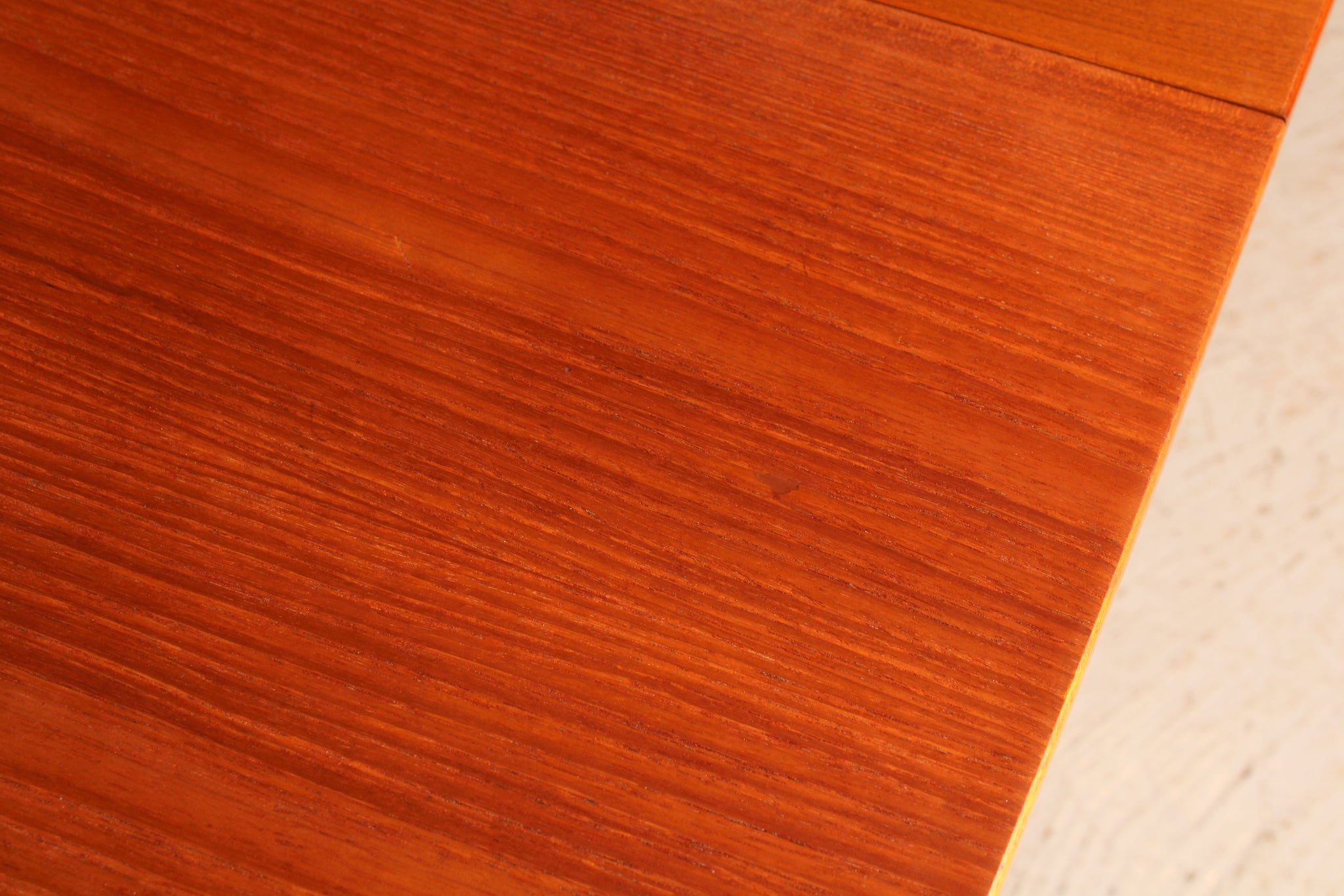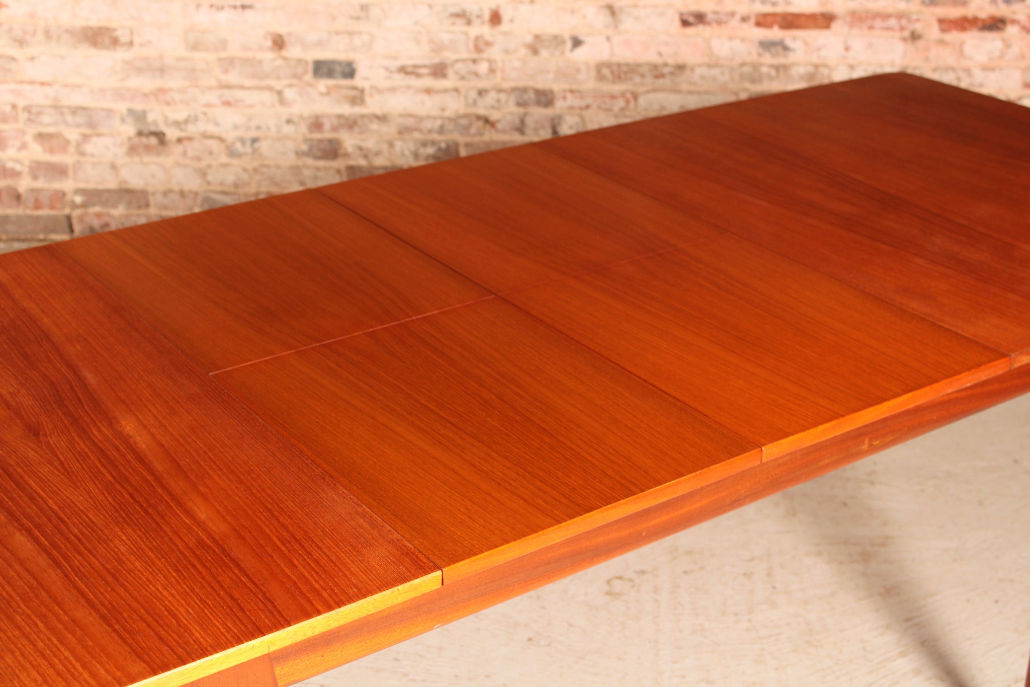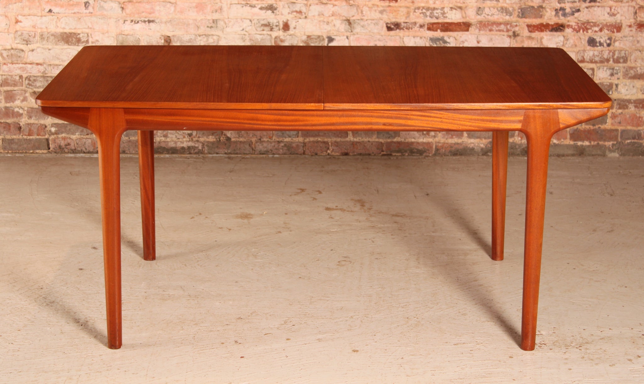 A mid century extending dining table designed by McIntosh and produced in the 1960s. Constructed in teak with a softly rounded rectangular top and distinctive leg joints, the table features a concealed double butterfly-leaf mechanism that extends it in stages. One or both leaves can be deployed depending on seating requirements. Fully extended, the table comfortably accommodates up to ten people. The leaves fold neatly away inside the frame when not in use, preserving the clean lines of the original form.