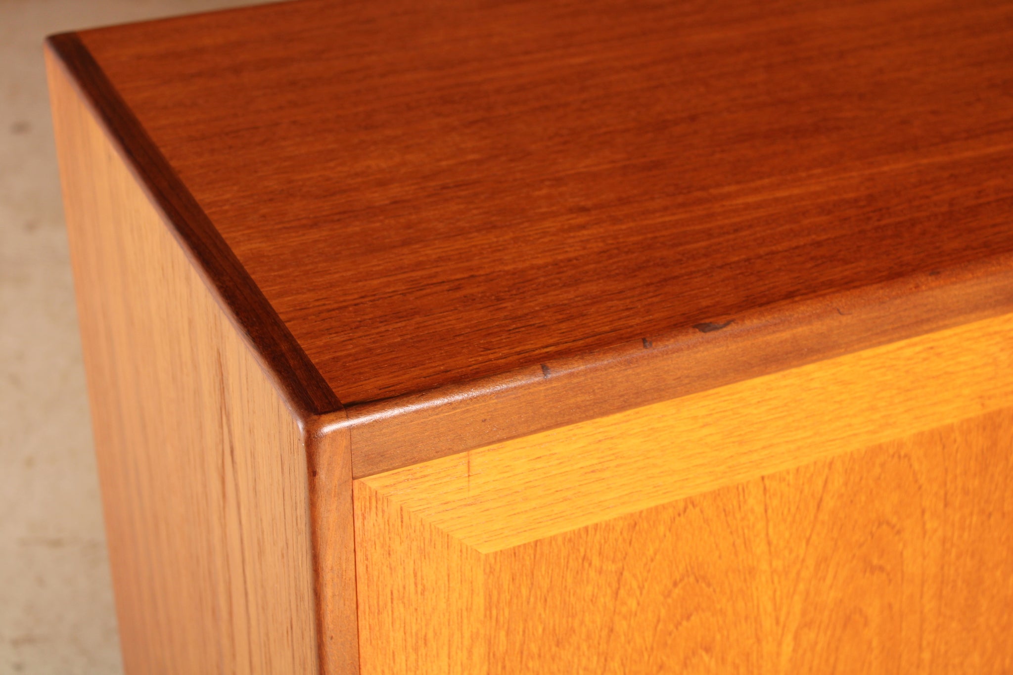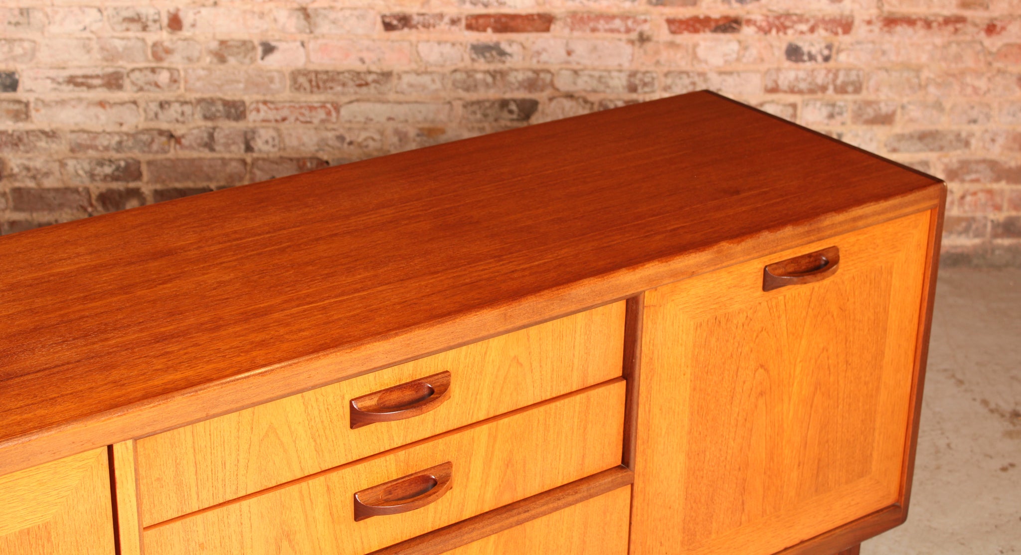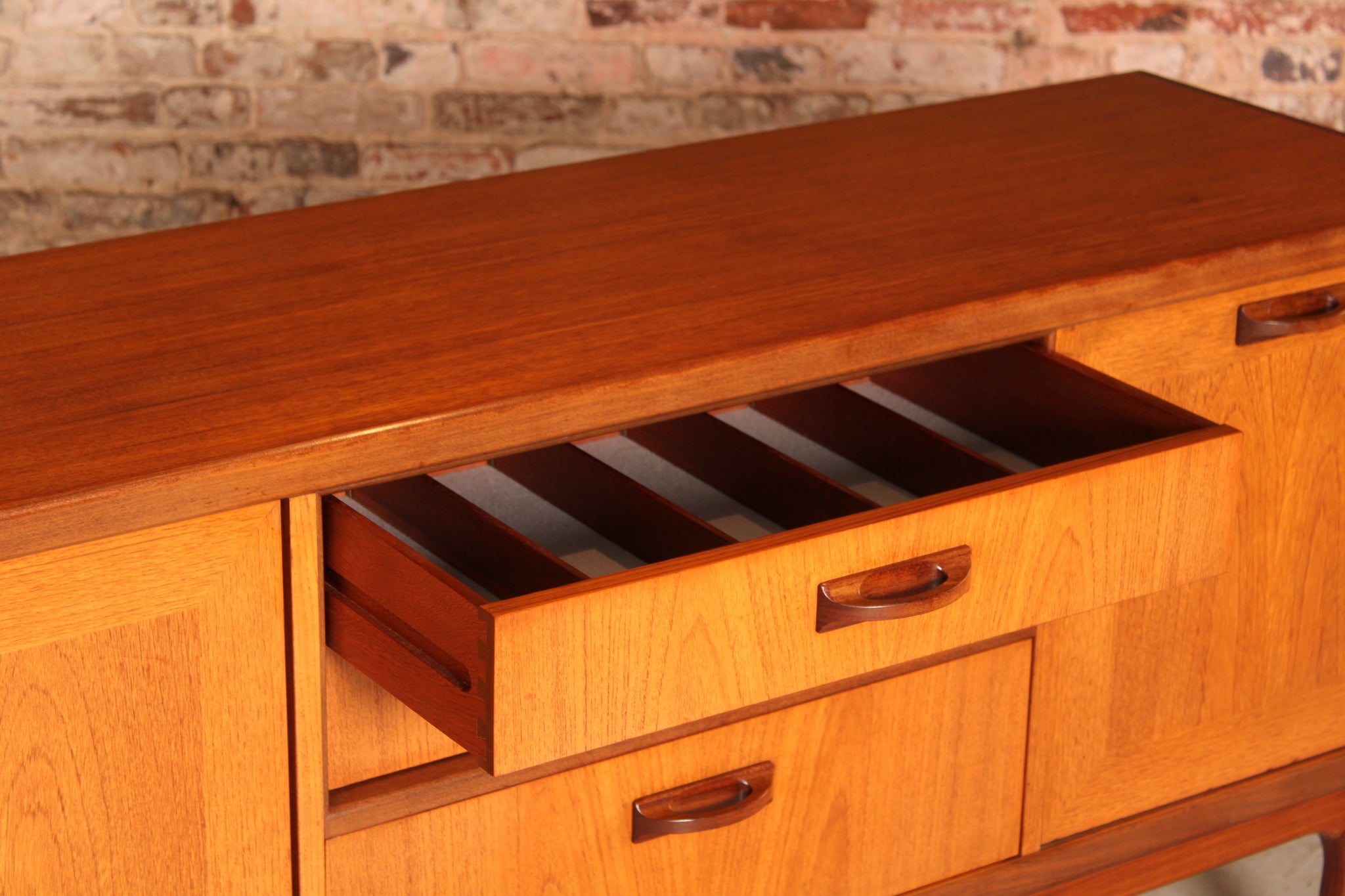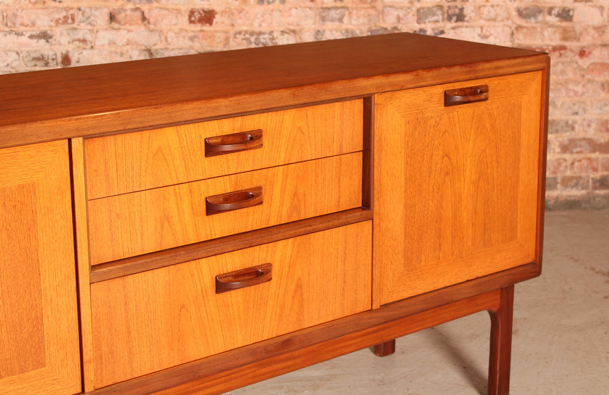 This mid-century G Plan Sierra range teak sideboard from the 1960s embodies timeless design and craftsmanship. Featuring three spacious drawers and two cabinet sections, it offers versatile storage options ideal for both dining and living areas. Crafted from quality teak wood, the piece has been meticulously restored to very good condition, preserving its original finish and structural integrity. Its clean lines and distinctive mid-century aesthetic make it a functional yet stylish addition for collectors and enthusiasts seeking authentic vintage furniture with enduring appeal.