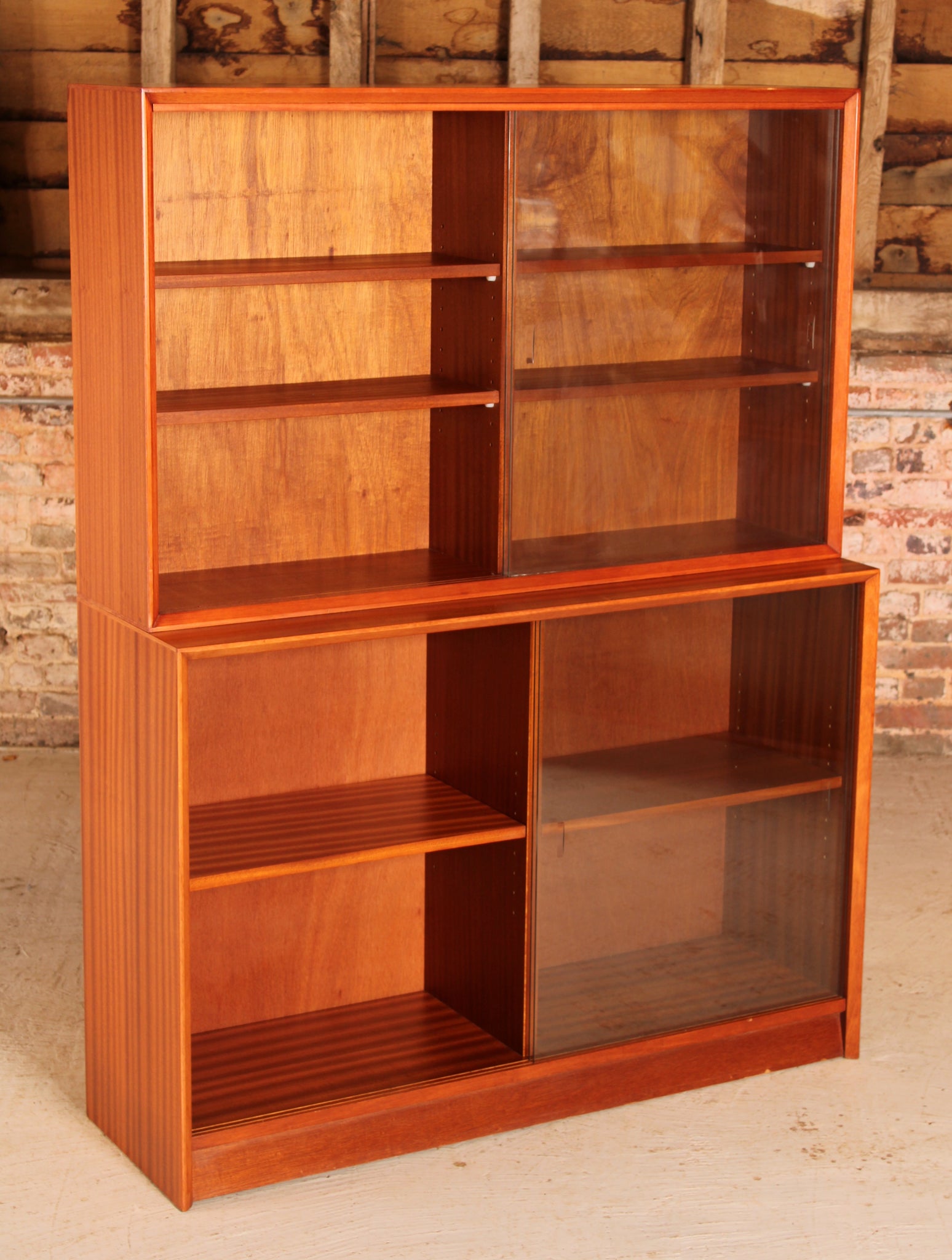 Mid Century glazed mahogany bookcase by Herbert E Gibbs, circa 1970s. Adjustable shelves and sliding glass doors. The top and bottom sections are separate and can be used individually. Excellent condition.