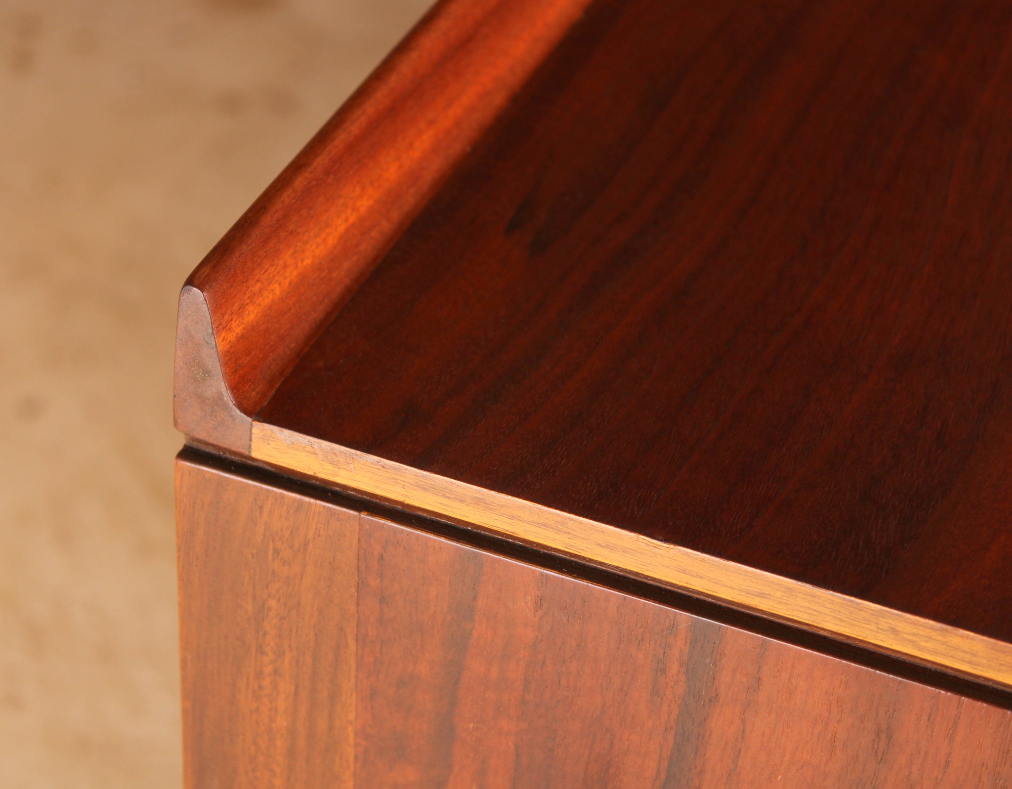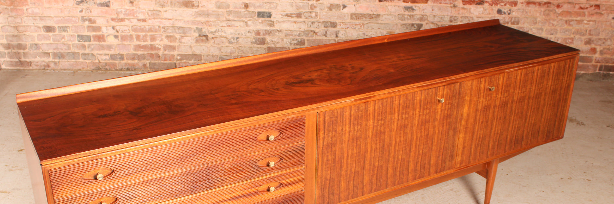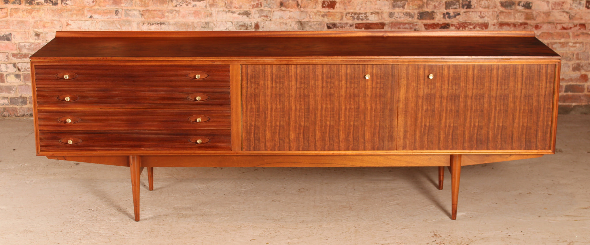 Mid Century 'Hamilton' walnut sideboard by Robert Heritage for Archie Shine, circa 1960s. 4 drawers with grooved fronts, with newly felted cutlery drawer. 2 cabinet sections. Striking grain pattern on top. Excellent fully restored condition.