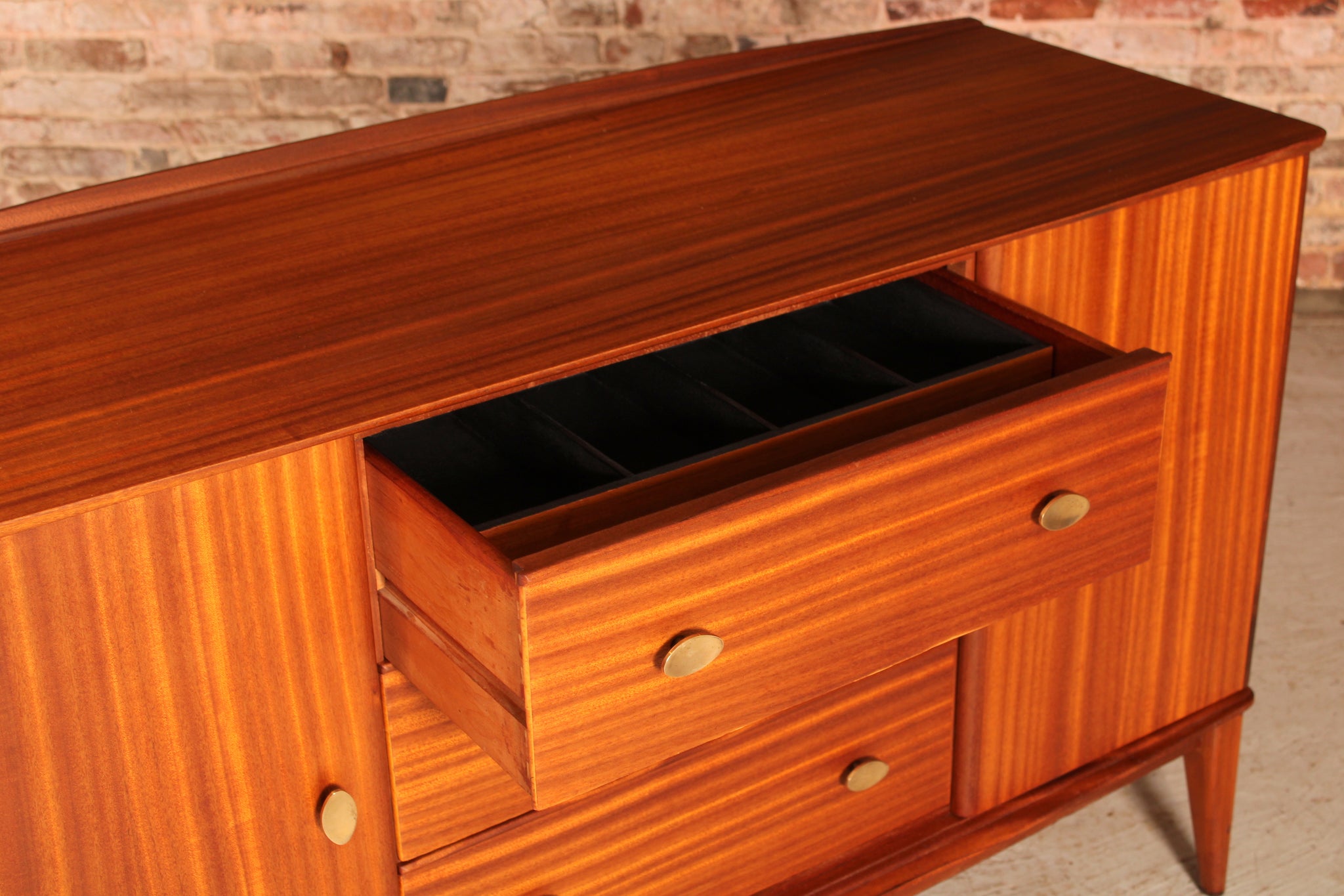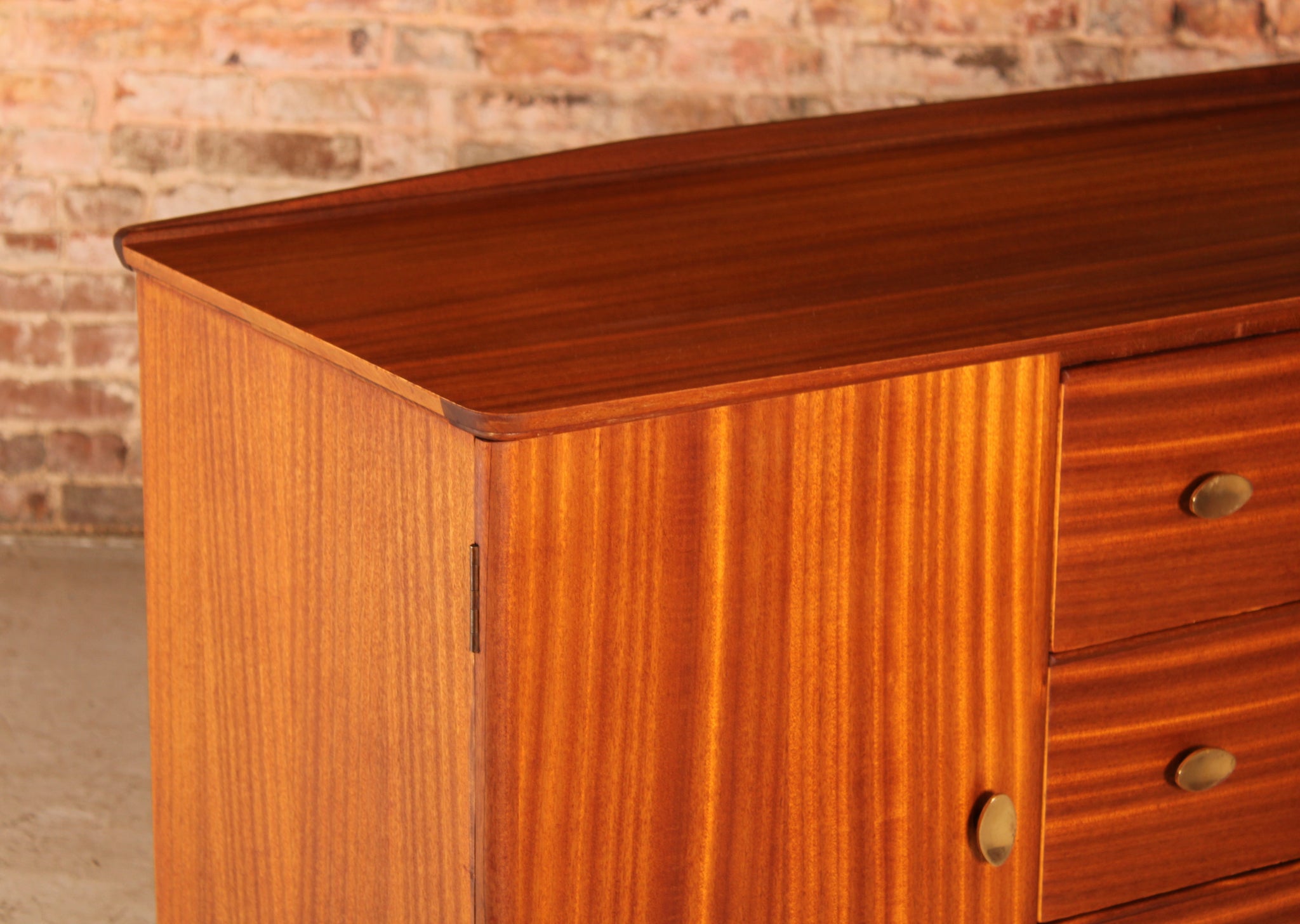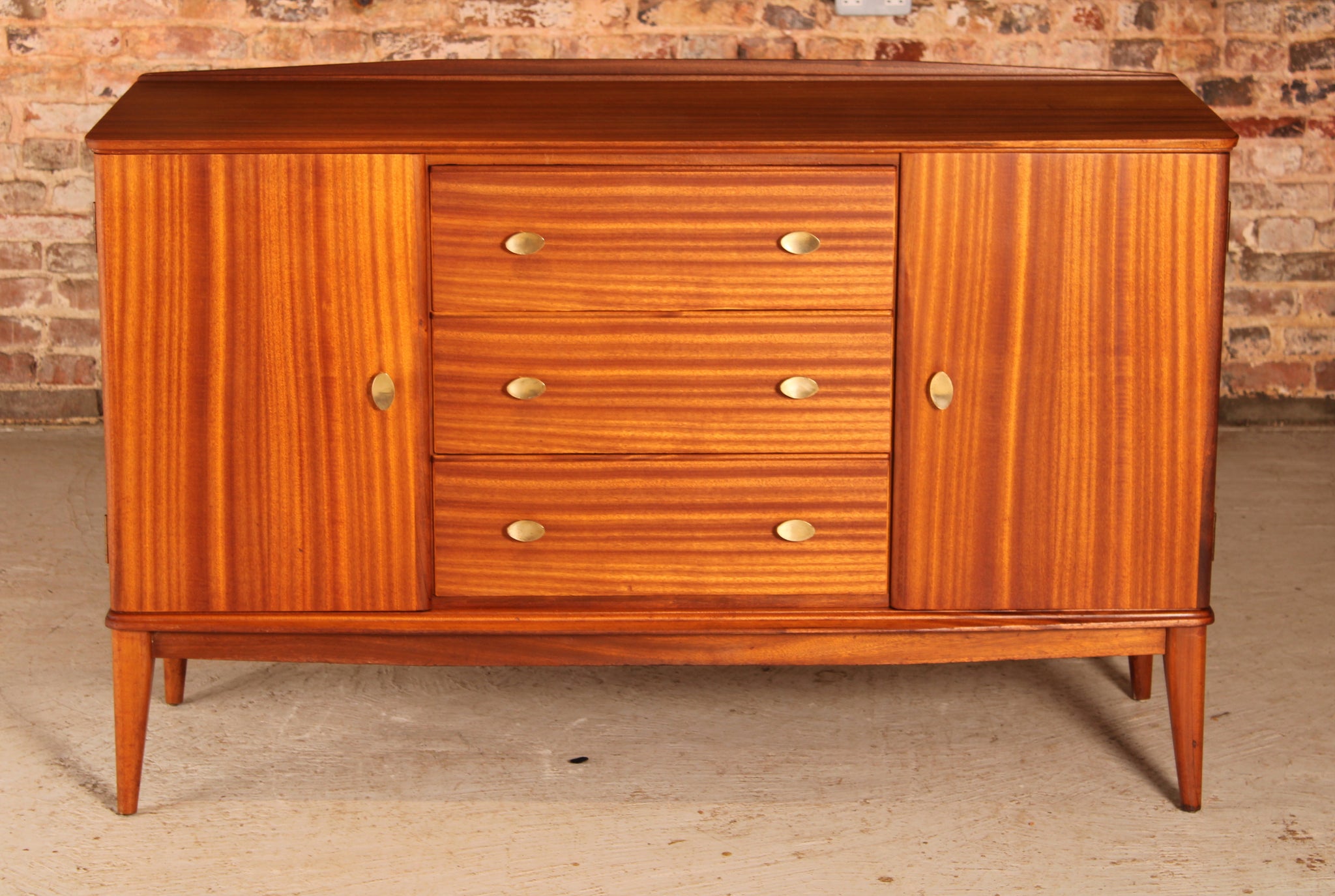 This distinguished Scottish sideboard exemplifies the refined craftsmanship of McIntosh's 1960s design heritage. Crafted from rich mahogany with period-appropriate brass hardware, the piece features three generous drawers and dual cabinet compartments, offering substantial storage with authentic mid-century elegance. Meticulously restored to showcase its original character and patina, this functional statement piece brings sophisticated vintage appeal to any interior scheme.