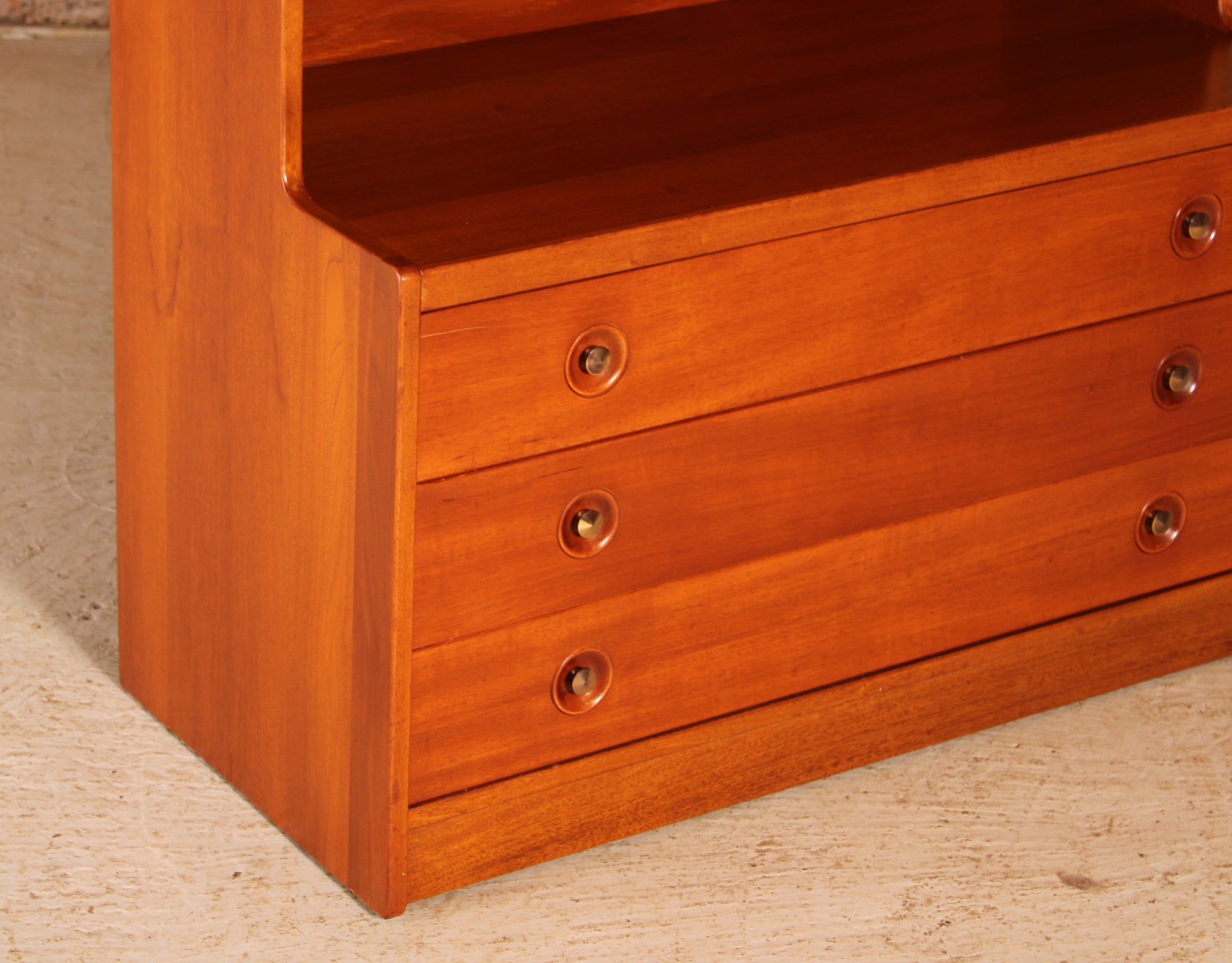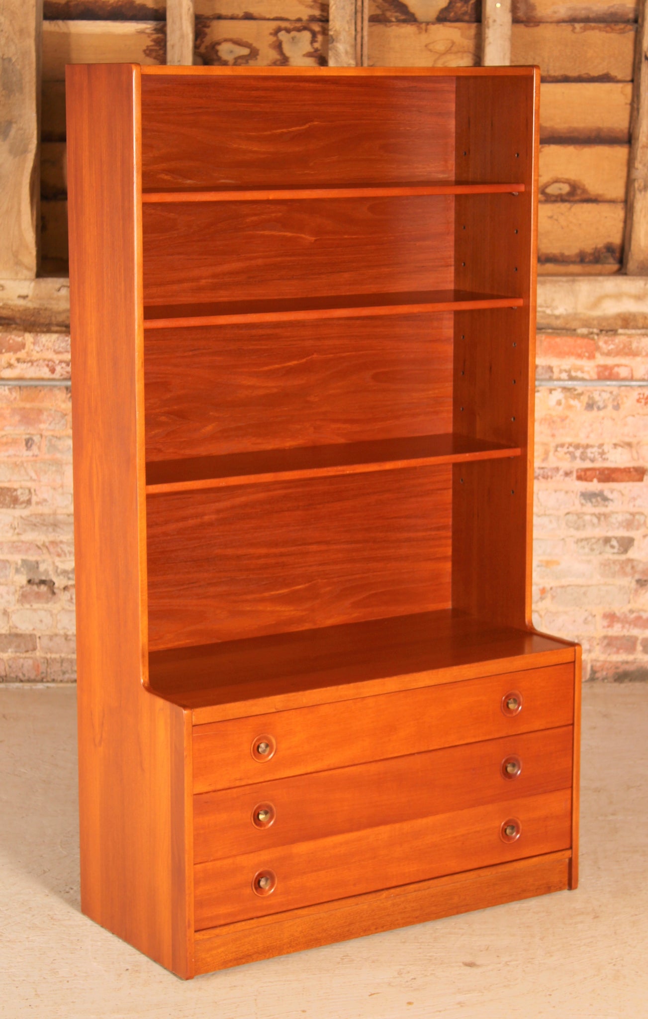 Mid Century teak bookcase, circa 1960s. 3 drawers with brass handles. Repolished and in excellent original condition.