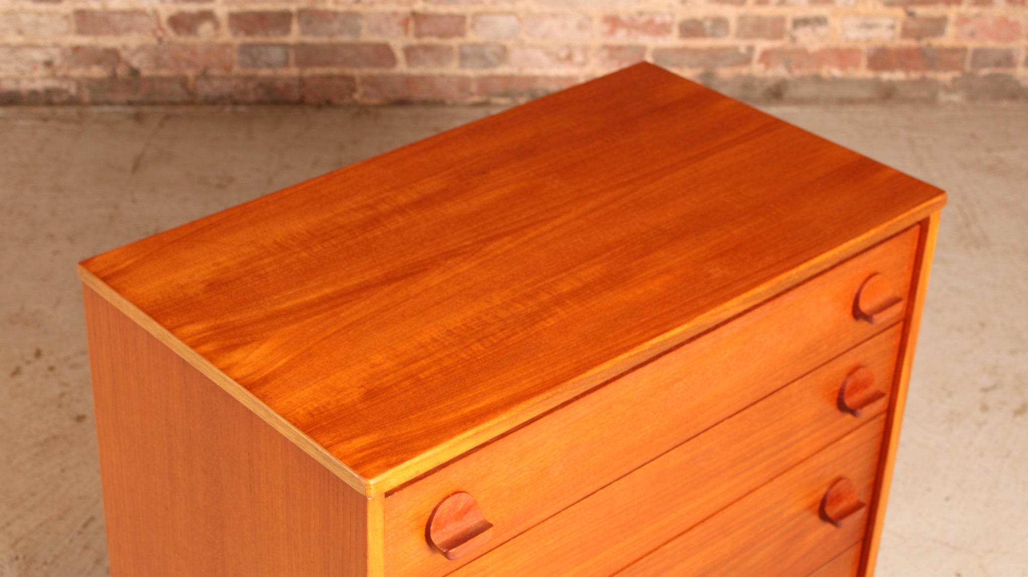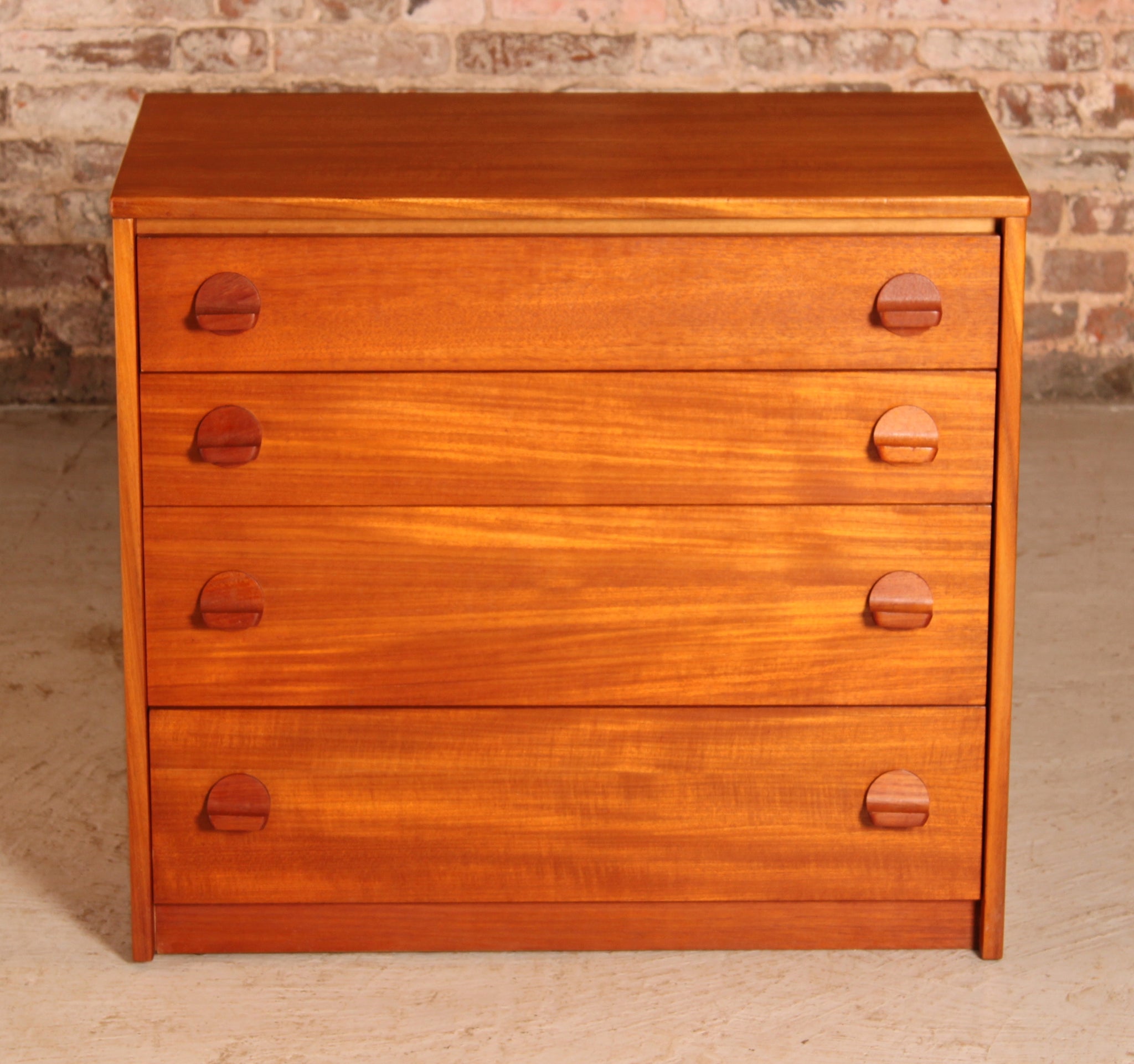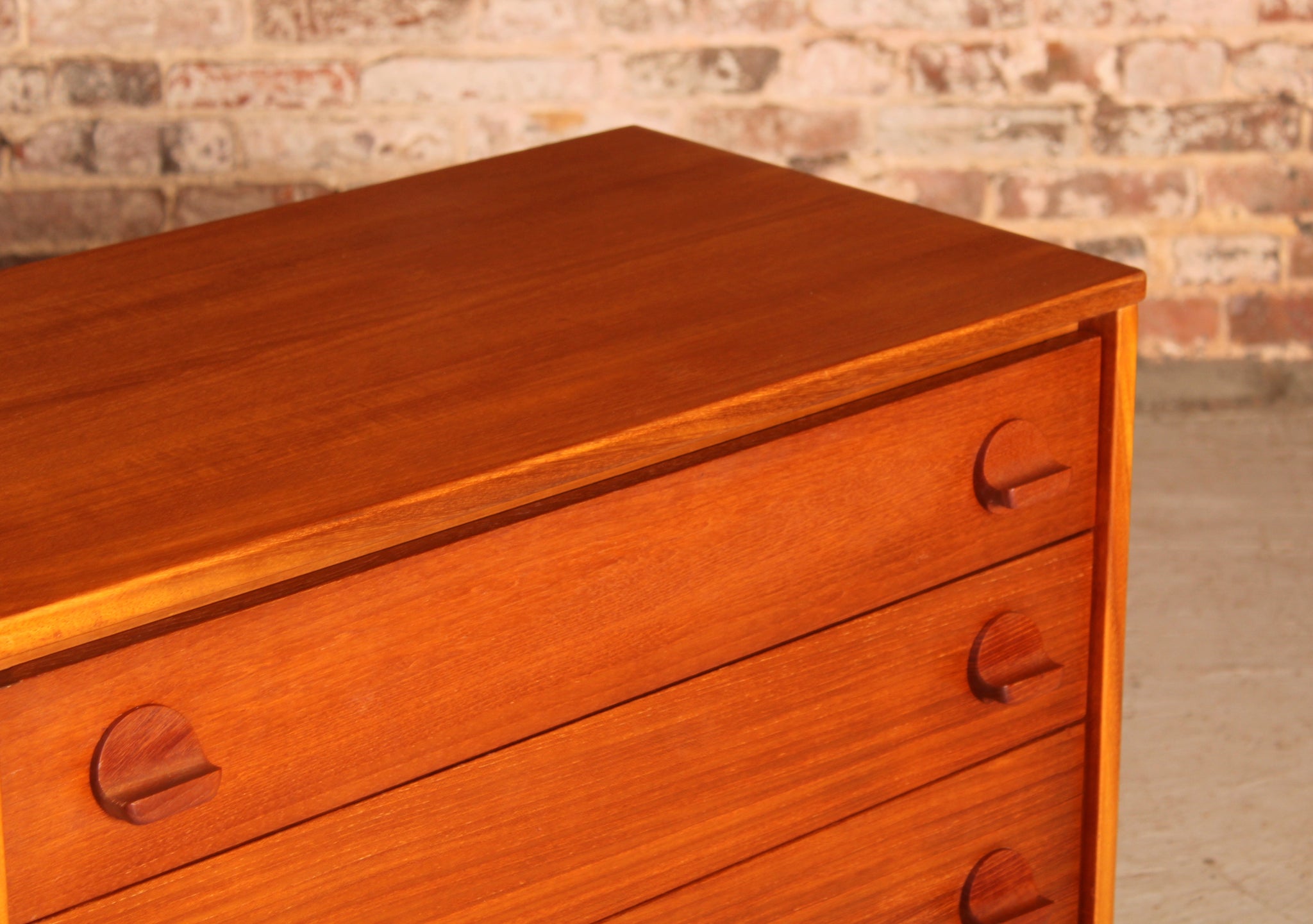 This Mid Century teak chest featuring four drawers by Stag, dating from the 1970s, has been carefully restored to an excellent condition. It highlights the elegant design and durable craftsmanship typical of the period.