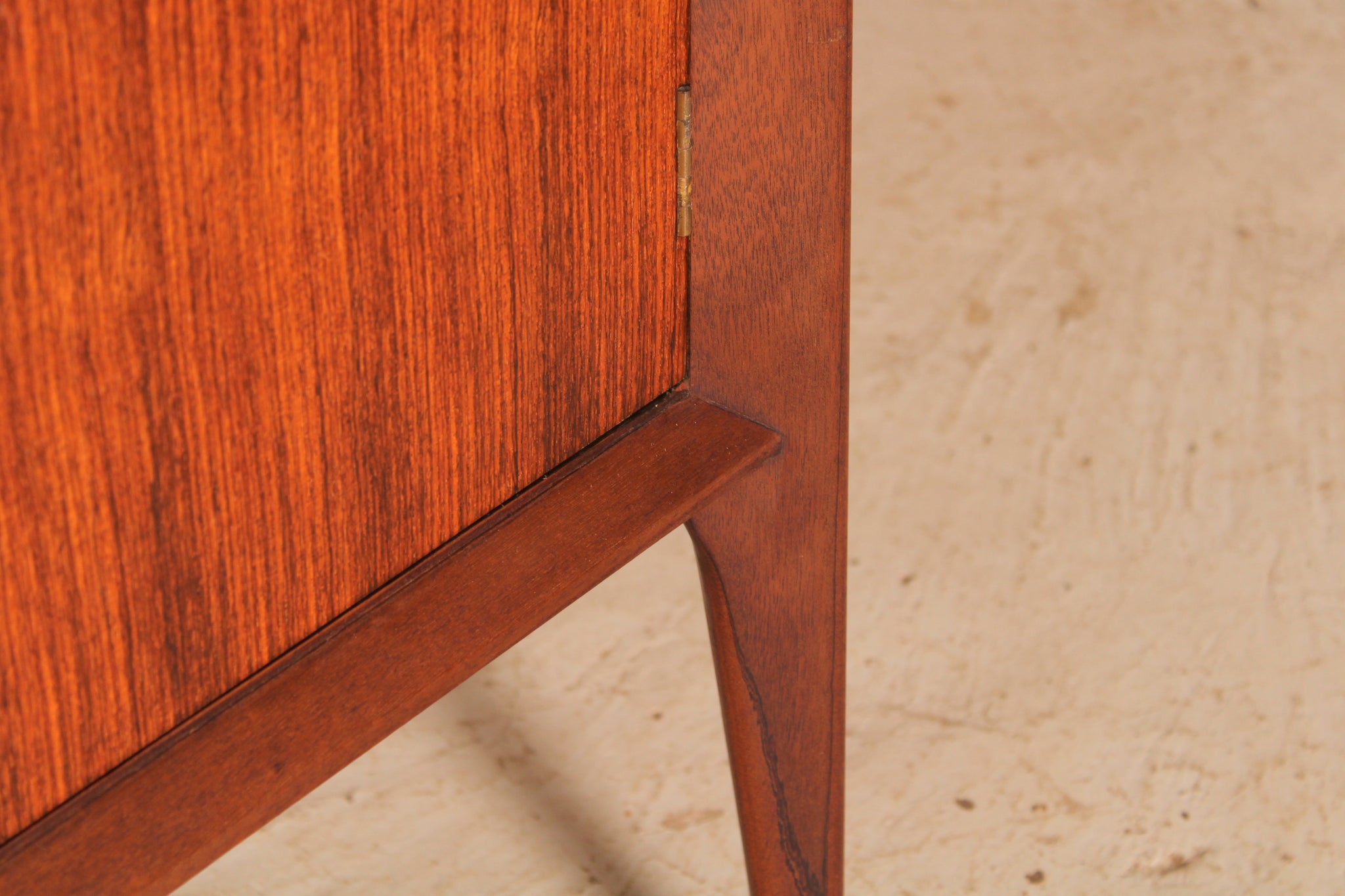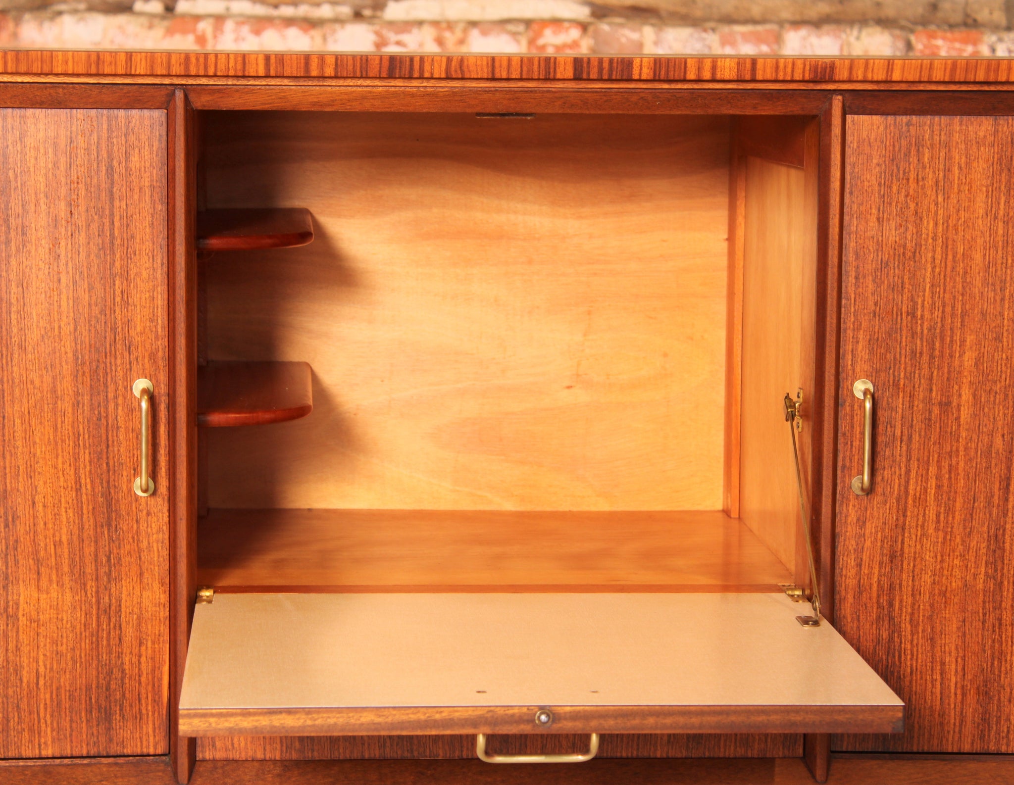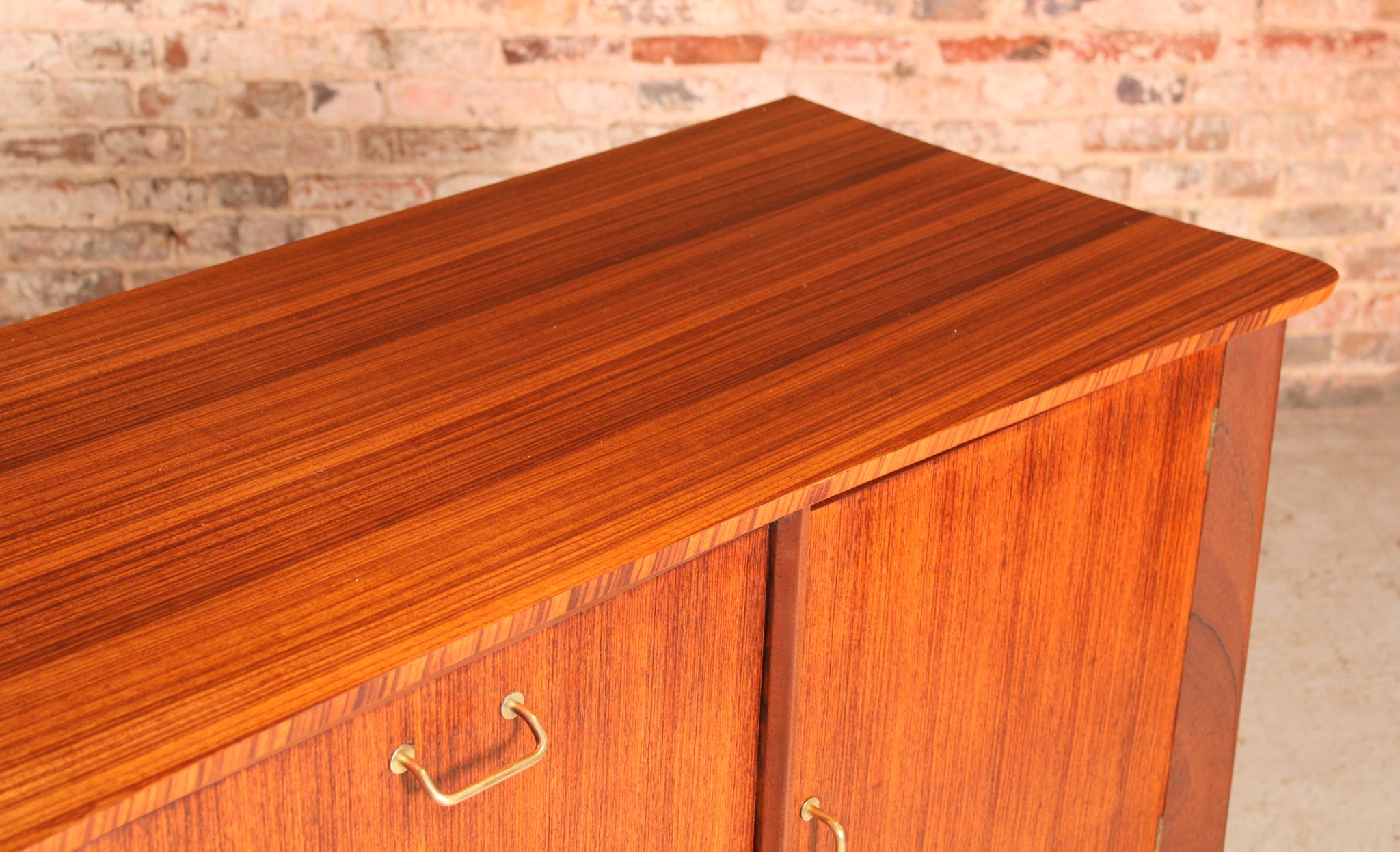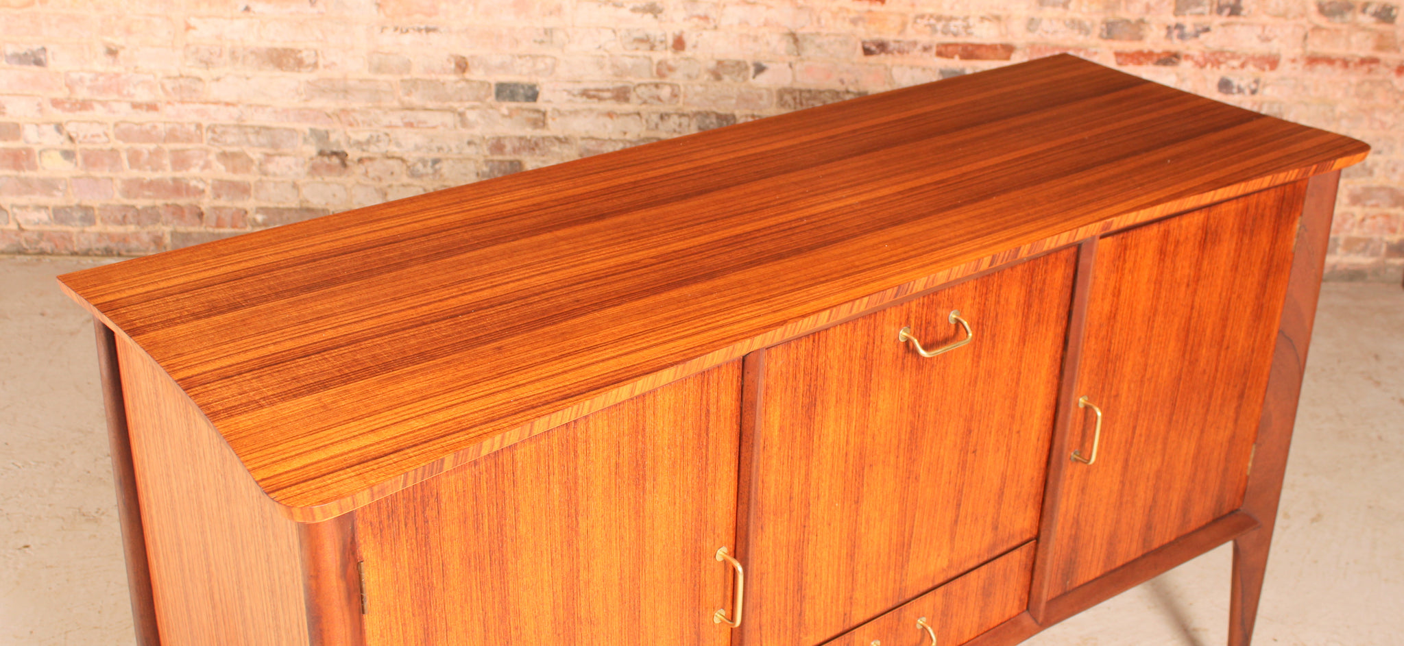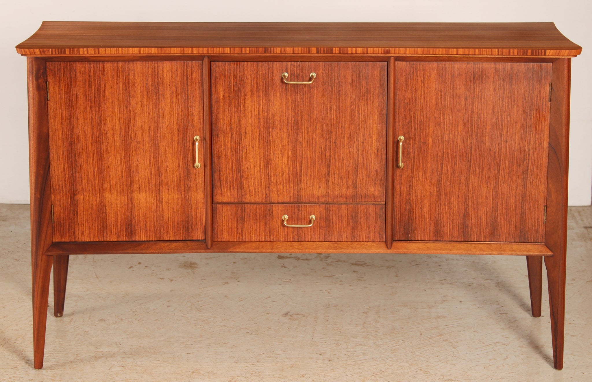 Mid Century tola and teak sideboard by Everest, circa 1960s. A drinks cabinet with a drop-down door, felt lined drawer and 2 cabinet sections. Excellent restored condition. £950