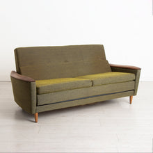 A midcentury two seater sofabed by Greaves & Thomas circa 1960s. The sofa is covered in original green fabric upholstery in excellent condition. Stains to both sides of removable mattress.