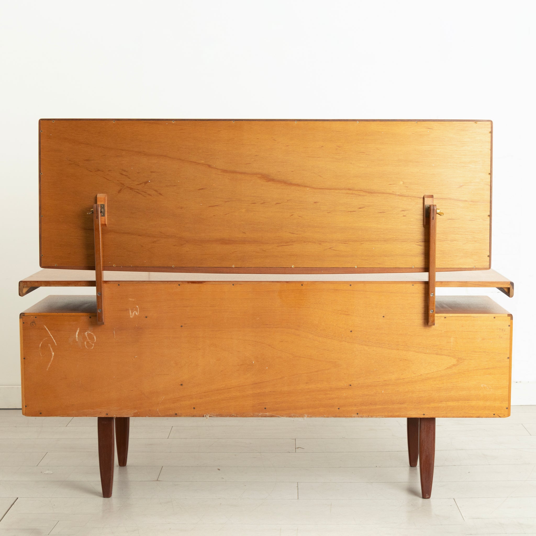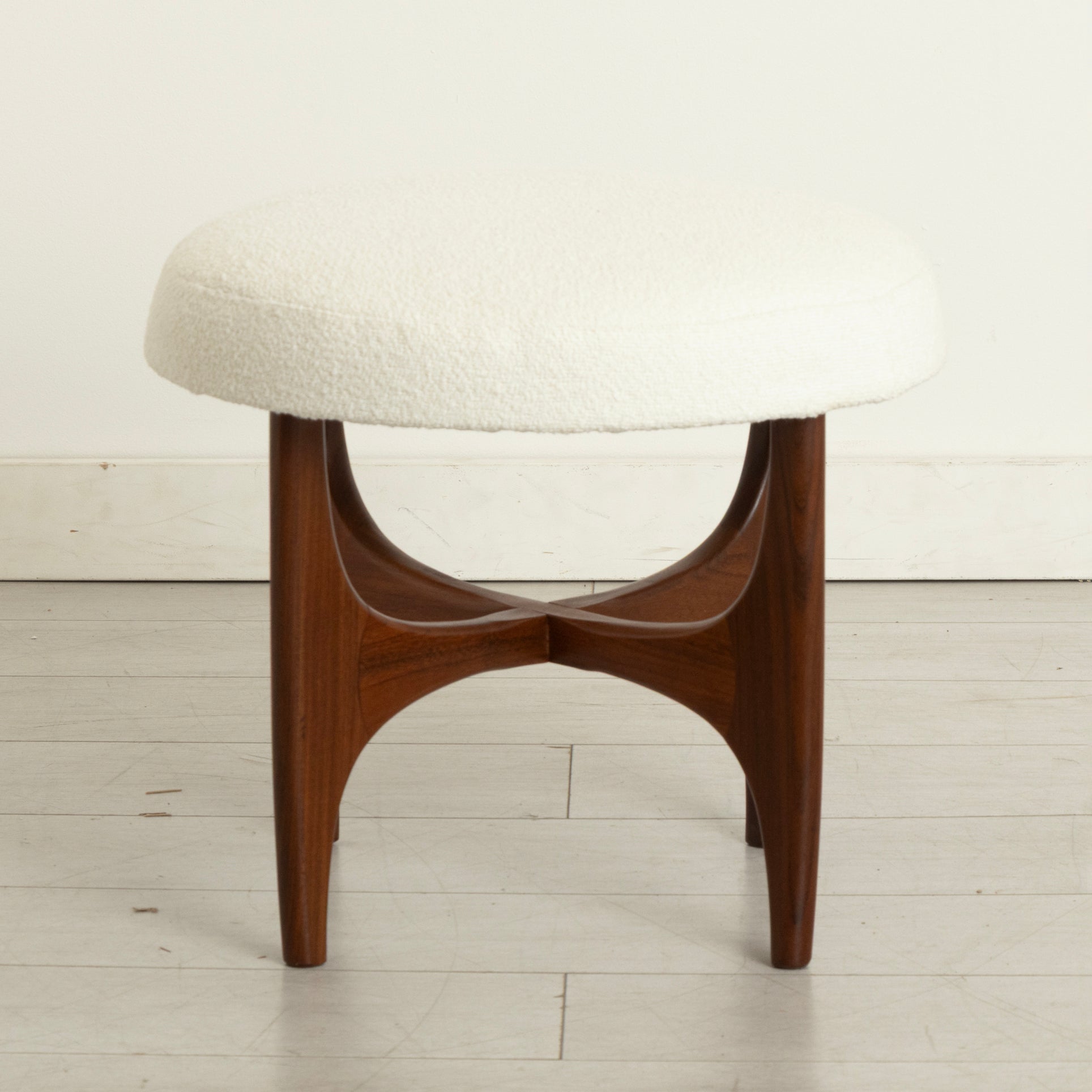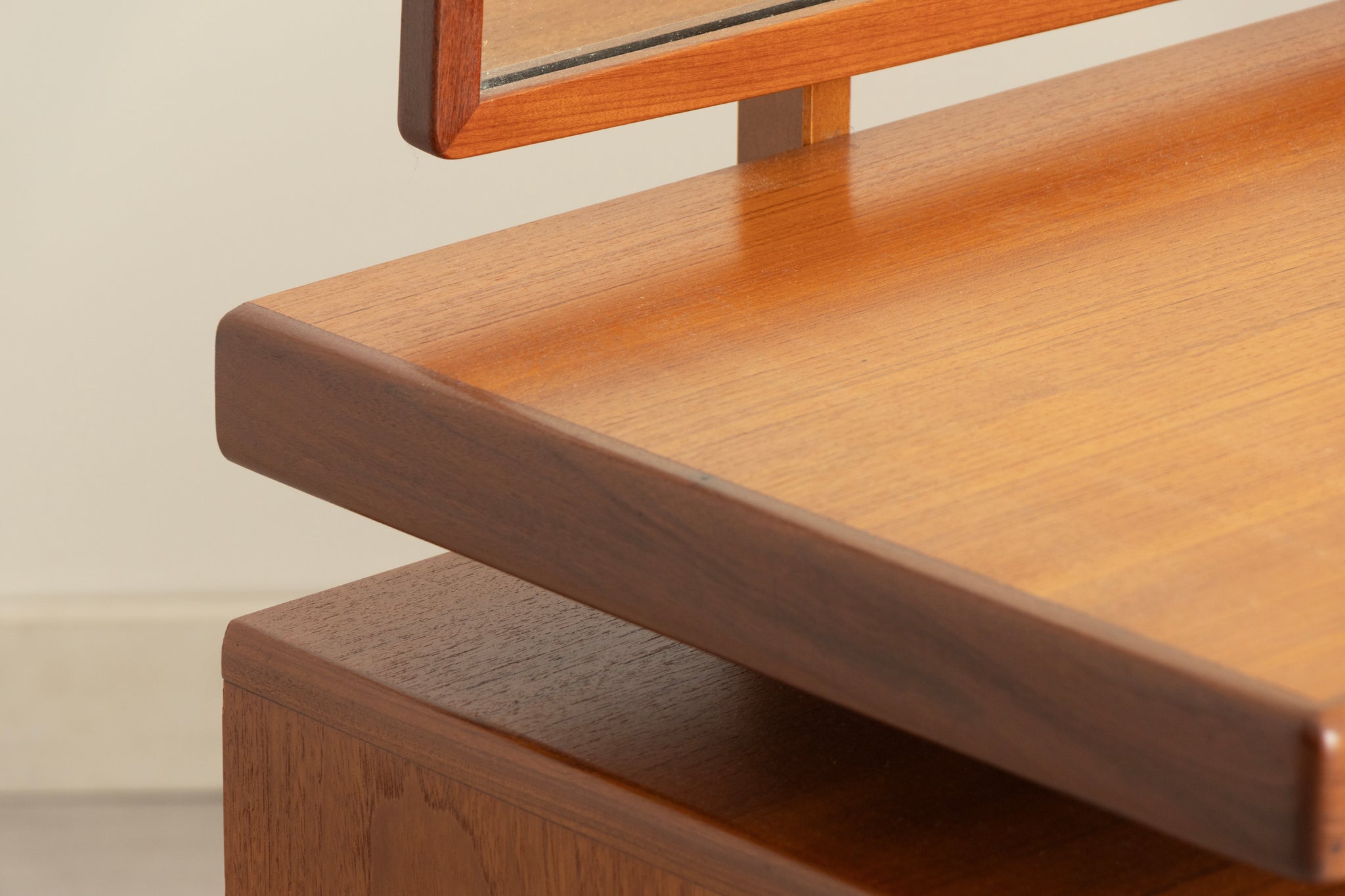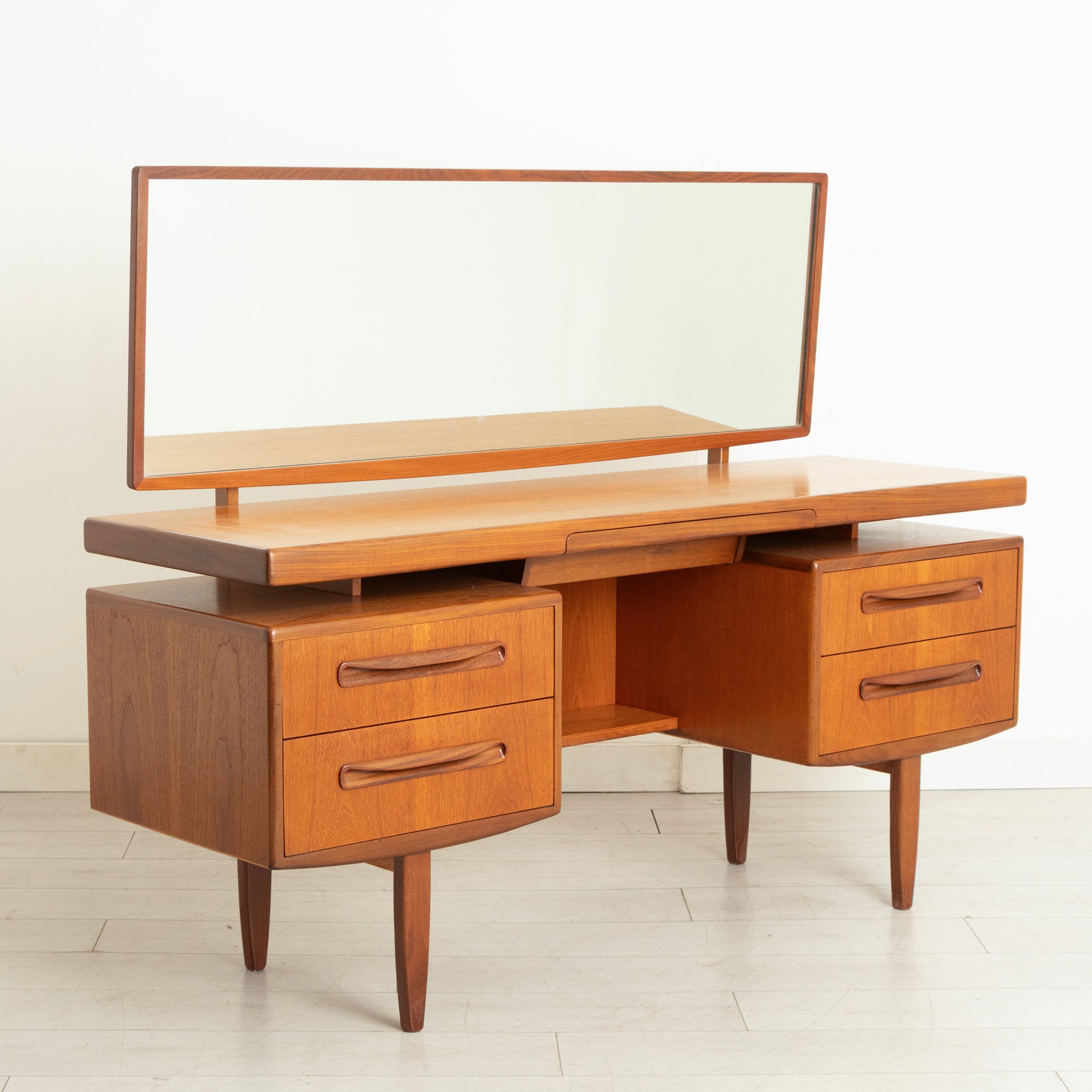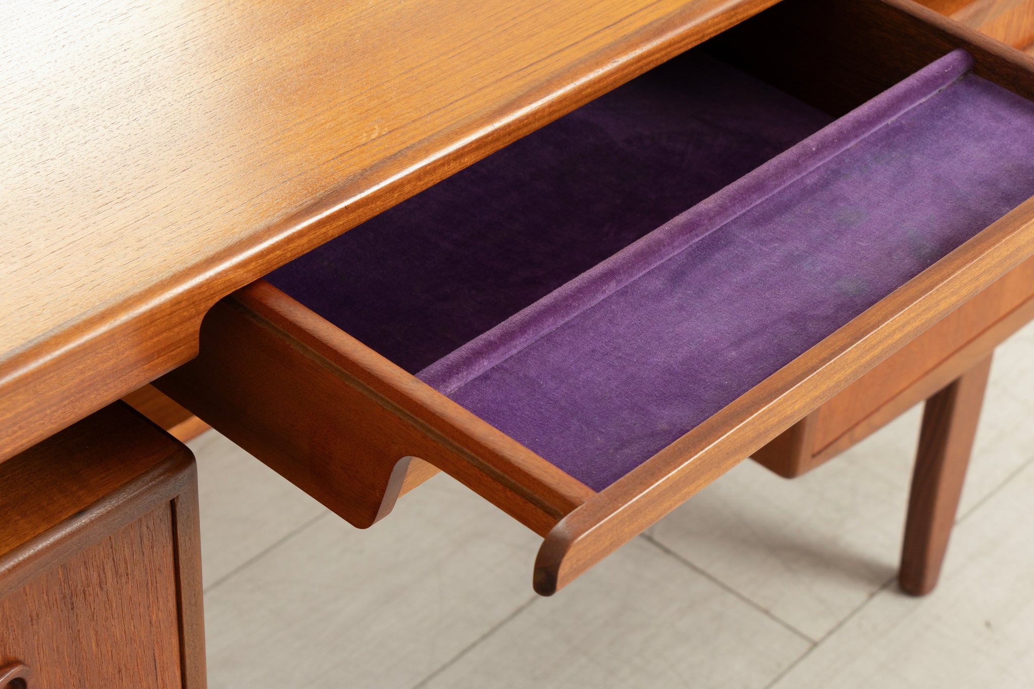 A midcentury teak dressing table and stool from the Fresco range by G Plan, British, c.1965. The symmetrical design features five drawers with sculpted recessed handles and a long horizontal mirror with rounded edges. The integrated central drawer sits slightly recessed beneath the floating top. Raised on tapering legs. The original matching stool has been newly reupholstered in white bouclé. A well-proportioned and practical piece, fully restored and presented in excellent condition.