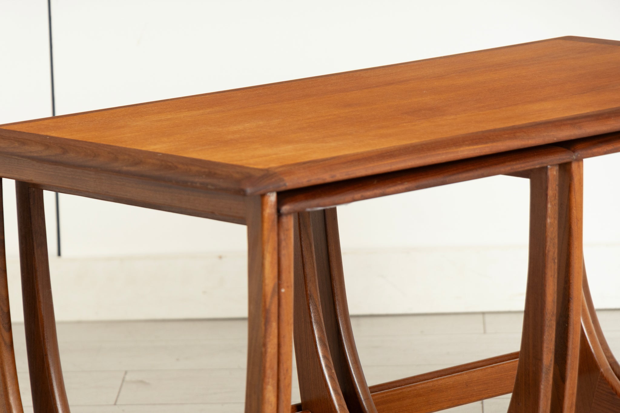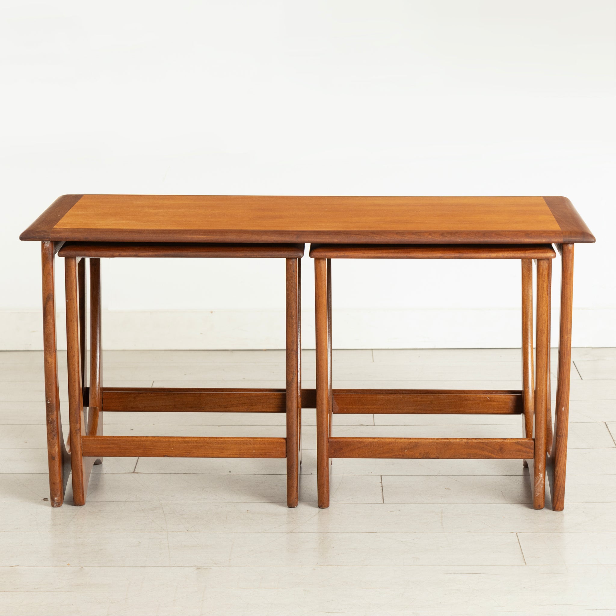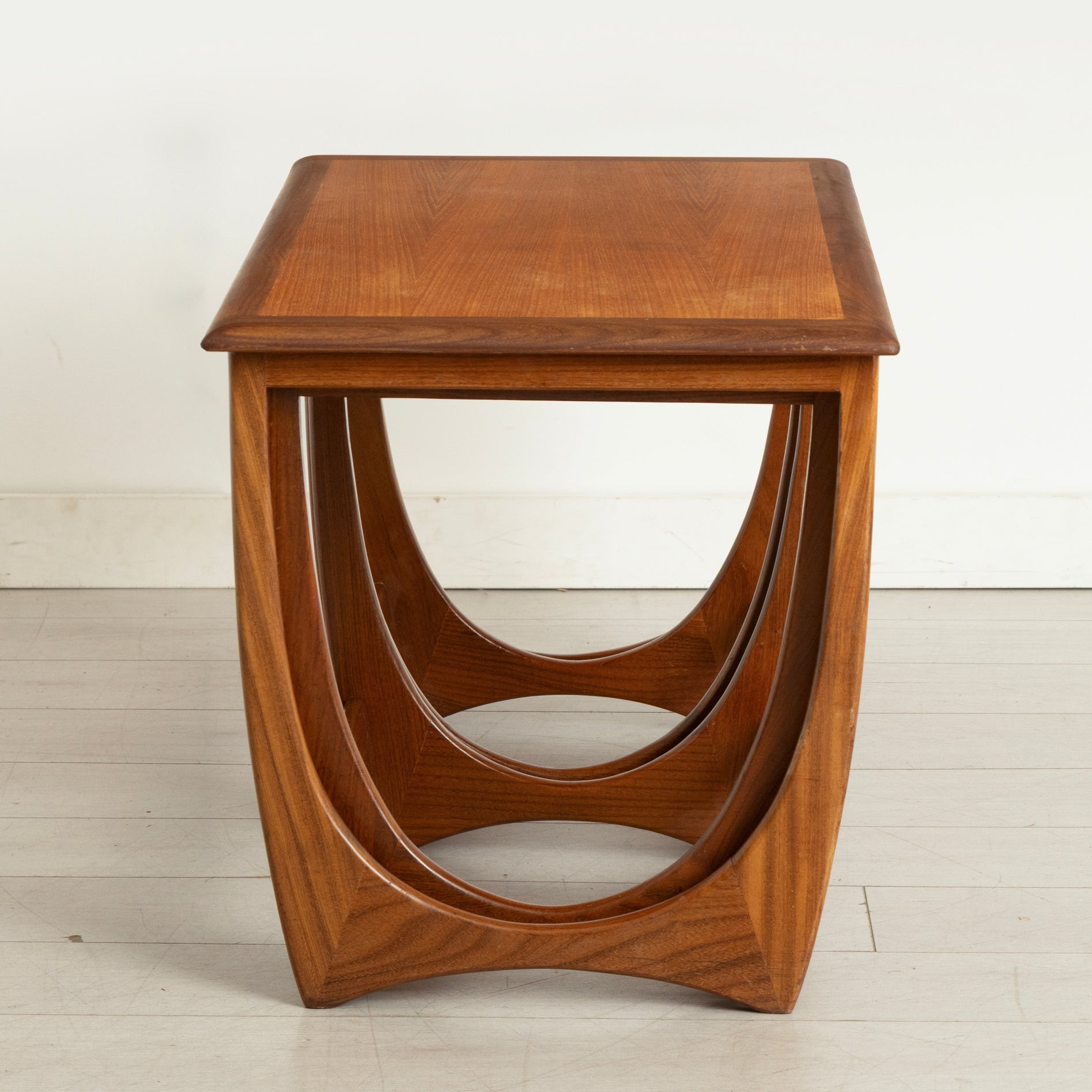 A midcentury teak nest of tables from the Astro Long John range by G Plan, c.1960. Designed with sculptural curved bases and veneered tops framed in solid teak, the set comprises one elongated table and two smaller square tables that neatly tuck beneath. The design reflects G Plan’s emphasis on practicality combined with modernist form, with a light golden tone to the surfaces and darker edging adding contrast. A classic piece of British midcentury furniture.