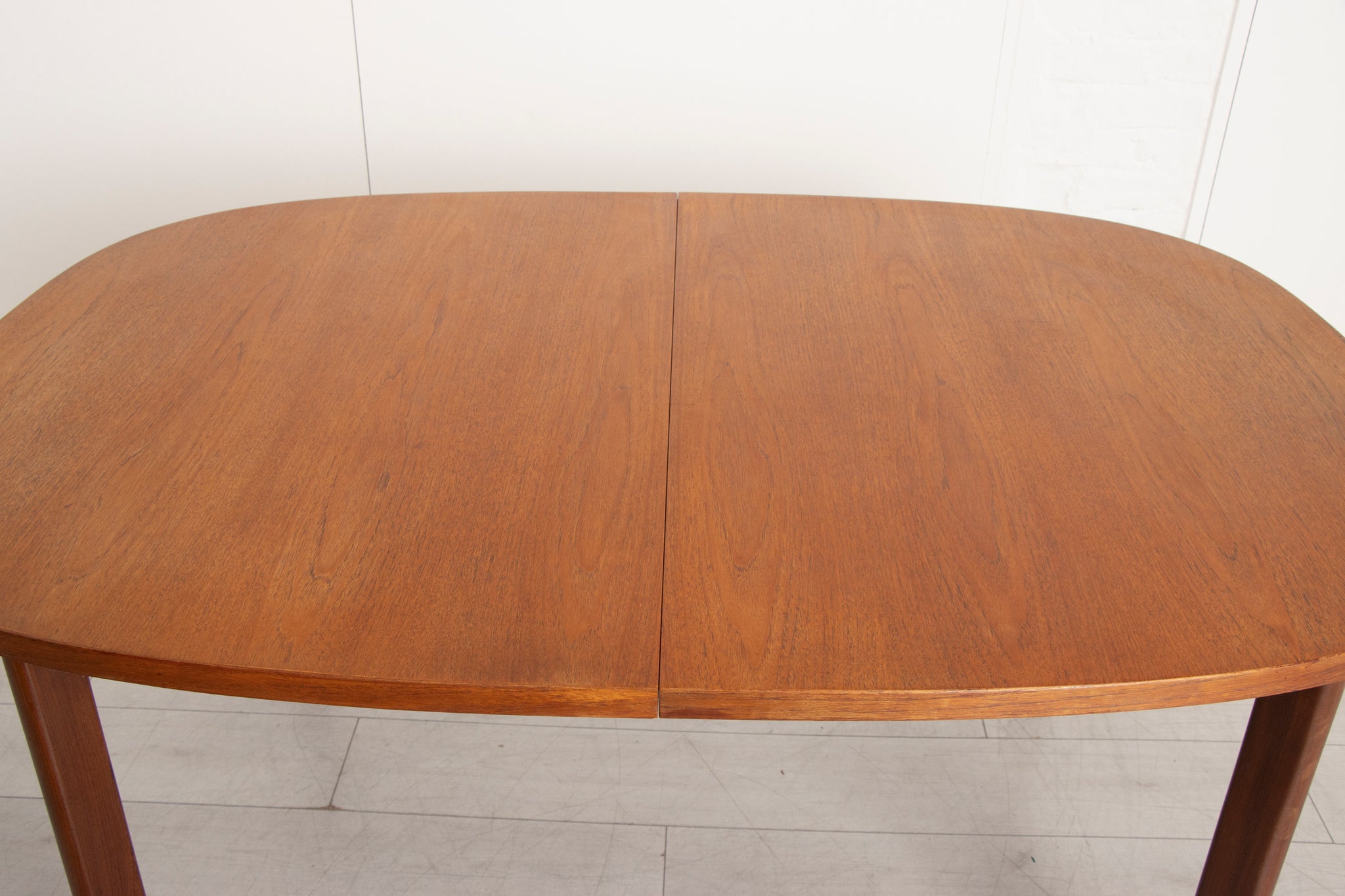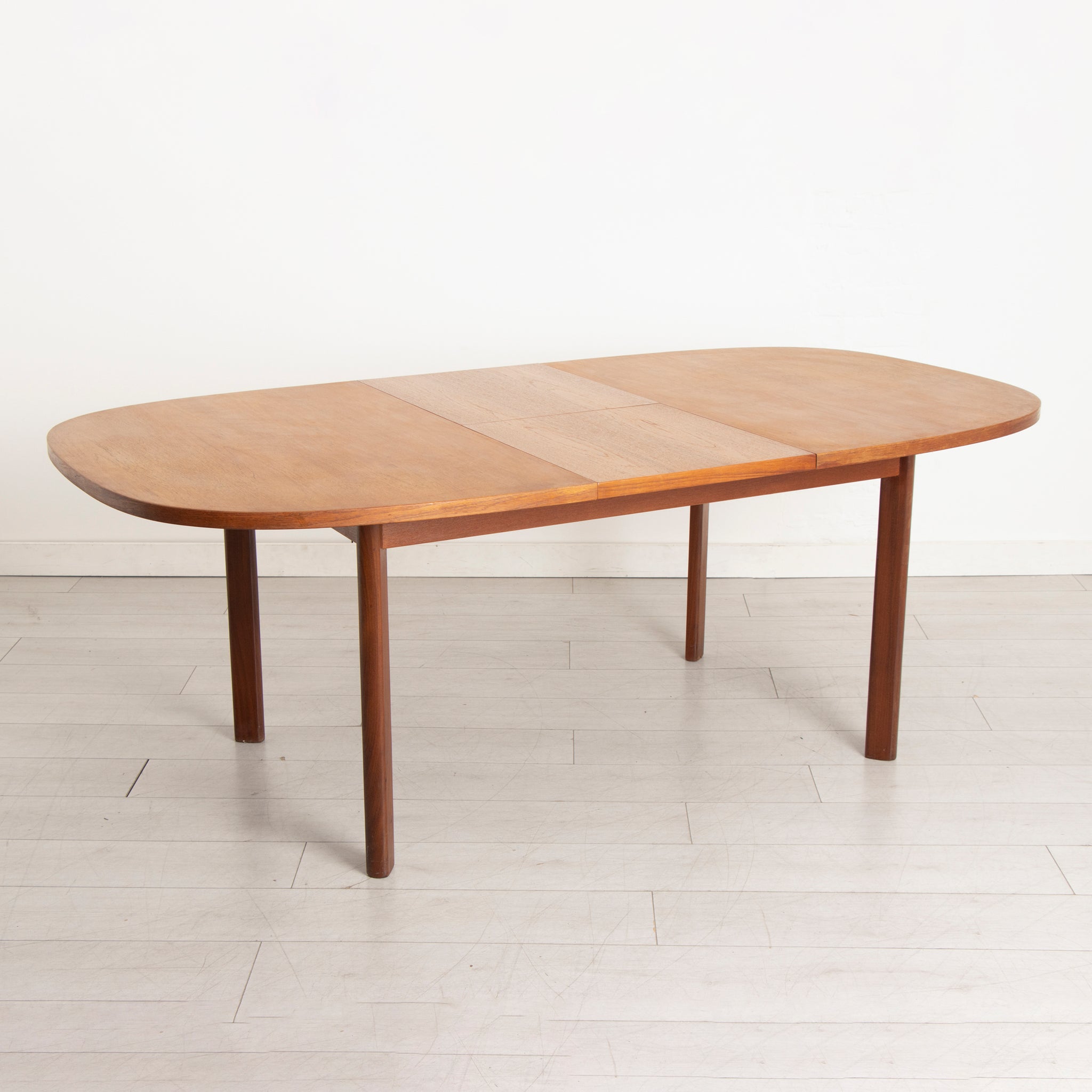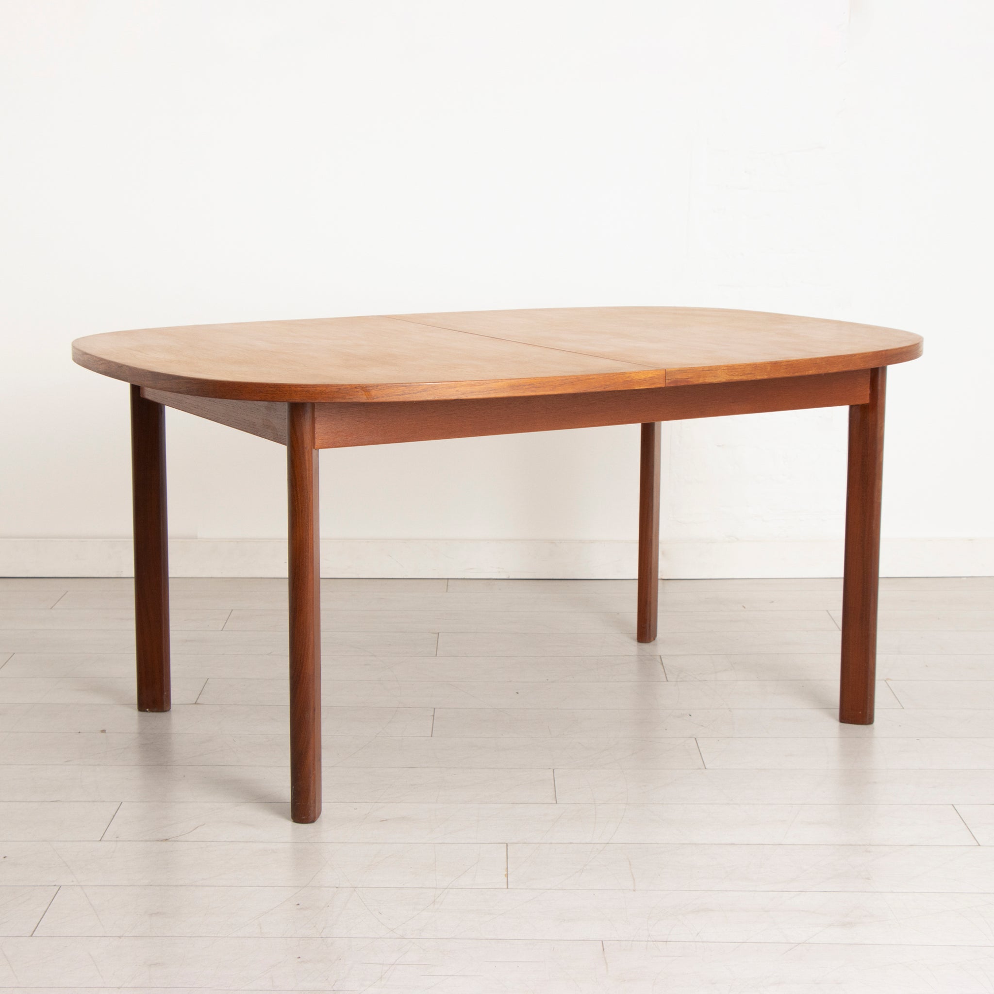 This midcentury G Plan extending teak dining table, circa 1970, is a fine example of modernist British design. Crafted from rich, warm teak, this table features a minimalist oval shape with clean lines and simple, elegant legs. The built-in butterfly extension mechanism allows the table to easily expand for larger gatherings, making it both functional and stylish. The extension leaf folds seamlessly into the centre of the table when not in use, maintaining a sleek appearance. Perfect for a vintage-inspired dining space, this table balances practicality with timeless design.