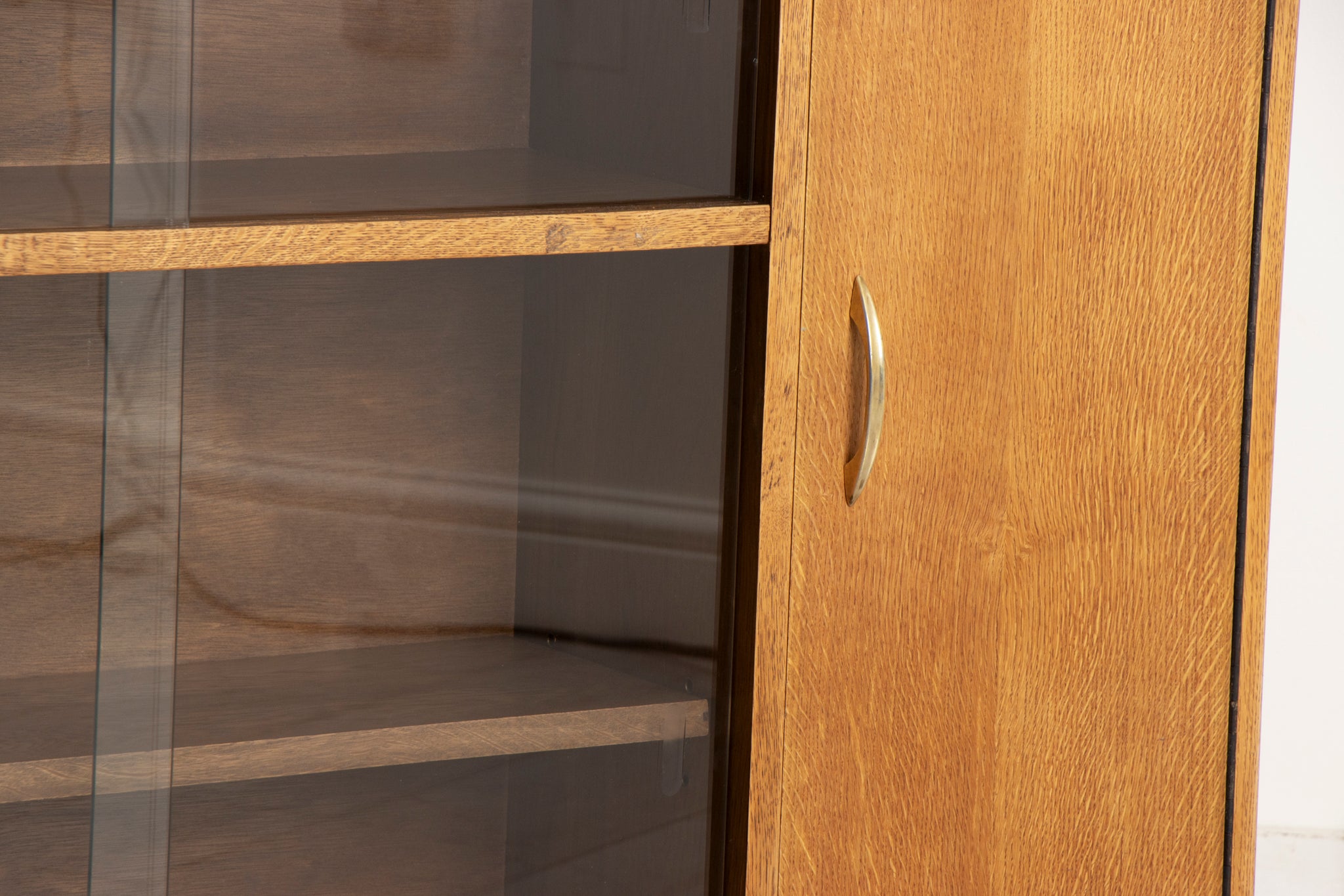 A midcentury solid oak bookcase from the 1960s. This bookcase features a practical and straightforward design, typical of the era. The left side of the bookcase has two shelves enclosed by sliding glass doors, which provide easy access while keeping the contents dust-free. The right side includes a cupboard with a solid oak door, offering additional storage space for items you may want to keep out of sight.