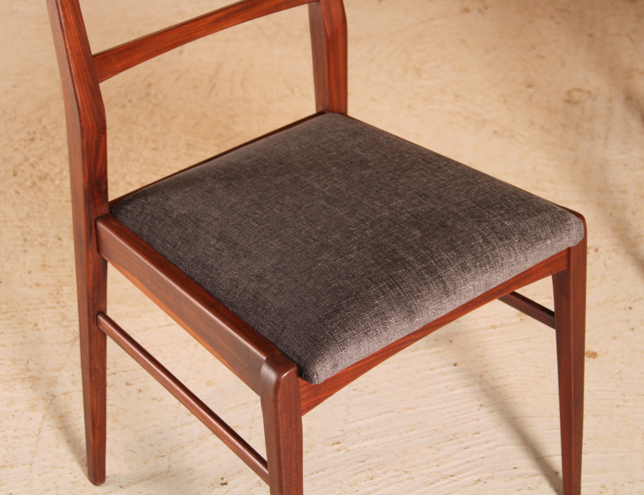 Set of 4 afromosia dining chairs by Richard Hornby for Heal's, circa 1960s. Newly reupholstered in premium slate grey fabric. Excellent condition.
