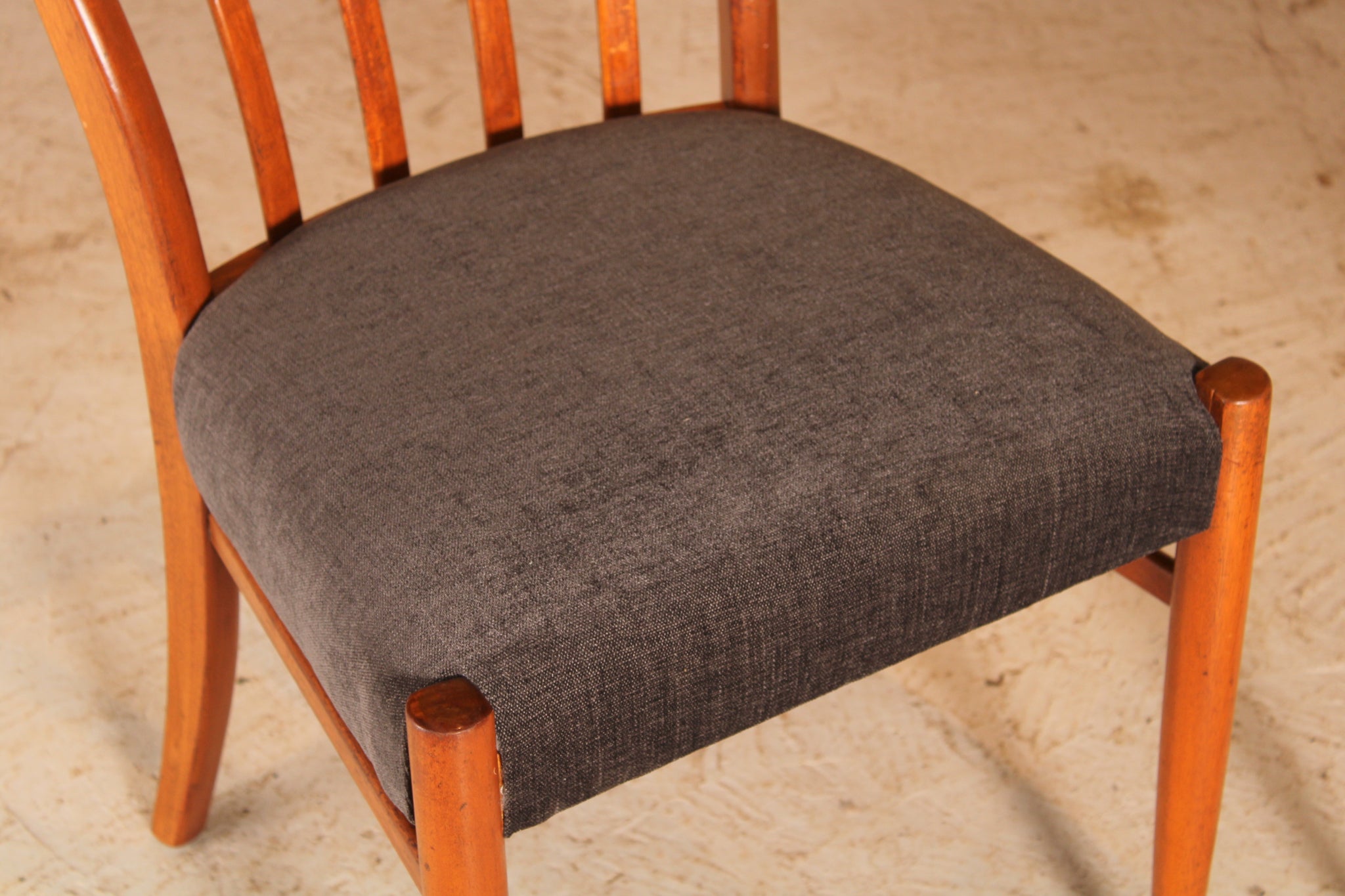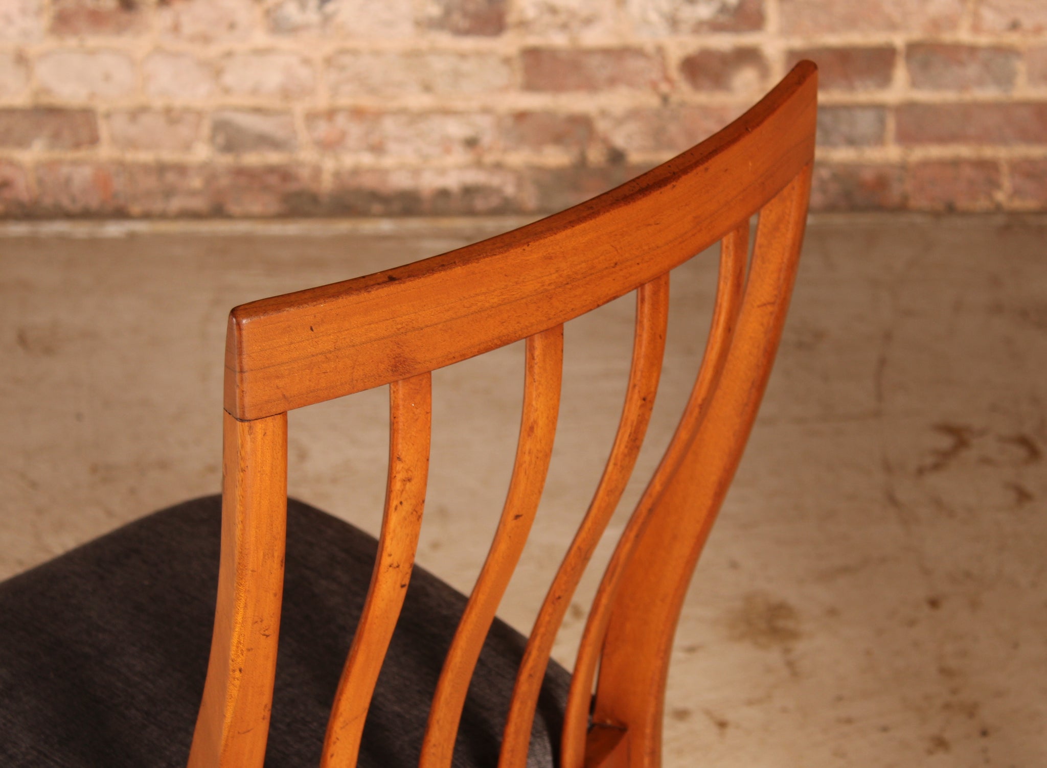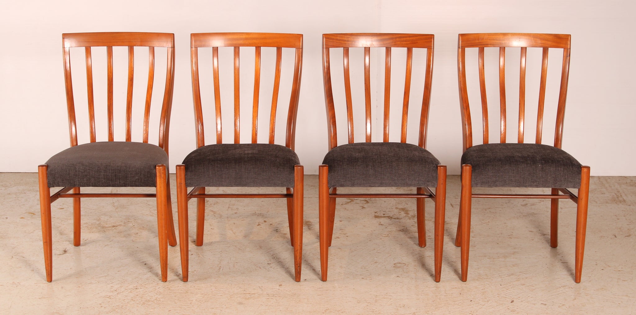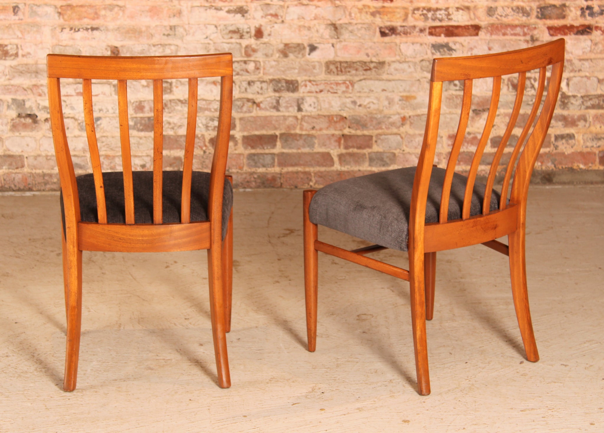 A set of four teak dining chairs from the Mid Century era, crafted by Greaves & Thomas around the 1960s. The frames have been meticulously polished, and the seats have been refurbished with slate grey fabric upholstery. These chairs are in excellent condition.