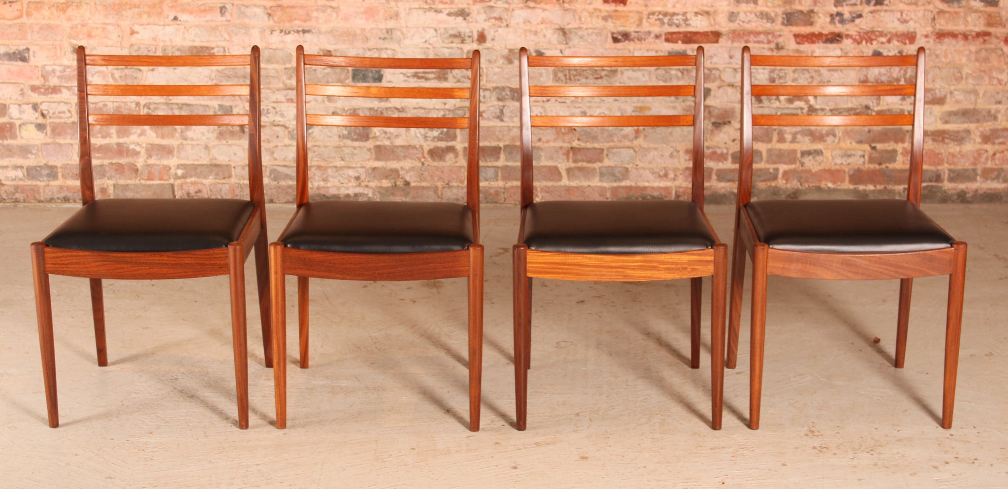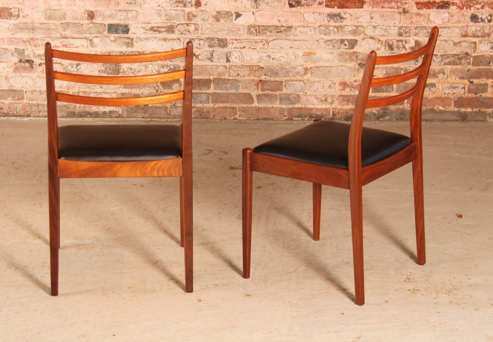 A set of four midcentury G Plan dining chairs circa 1960s. Newly upholstered with premium black vinyl.