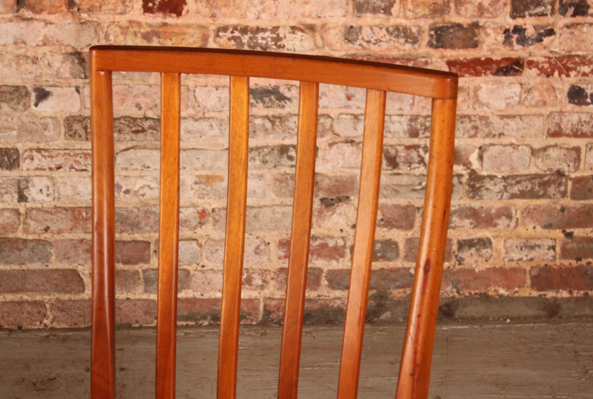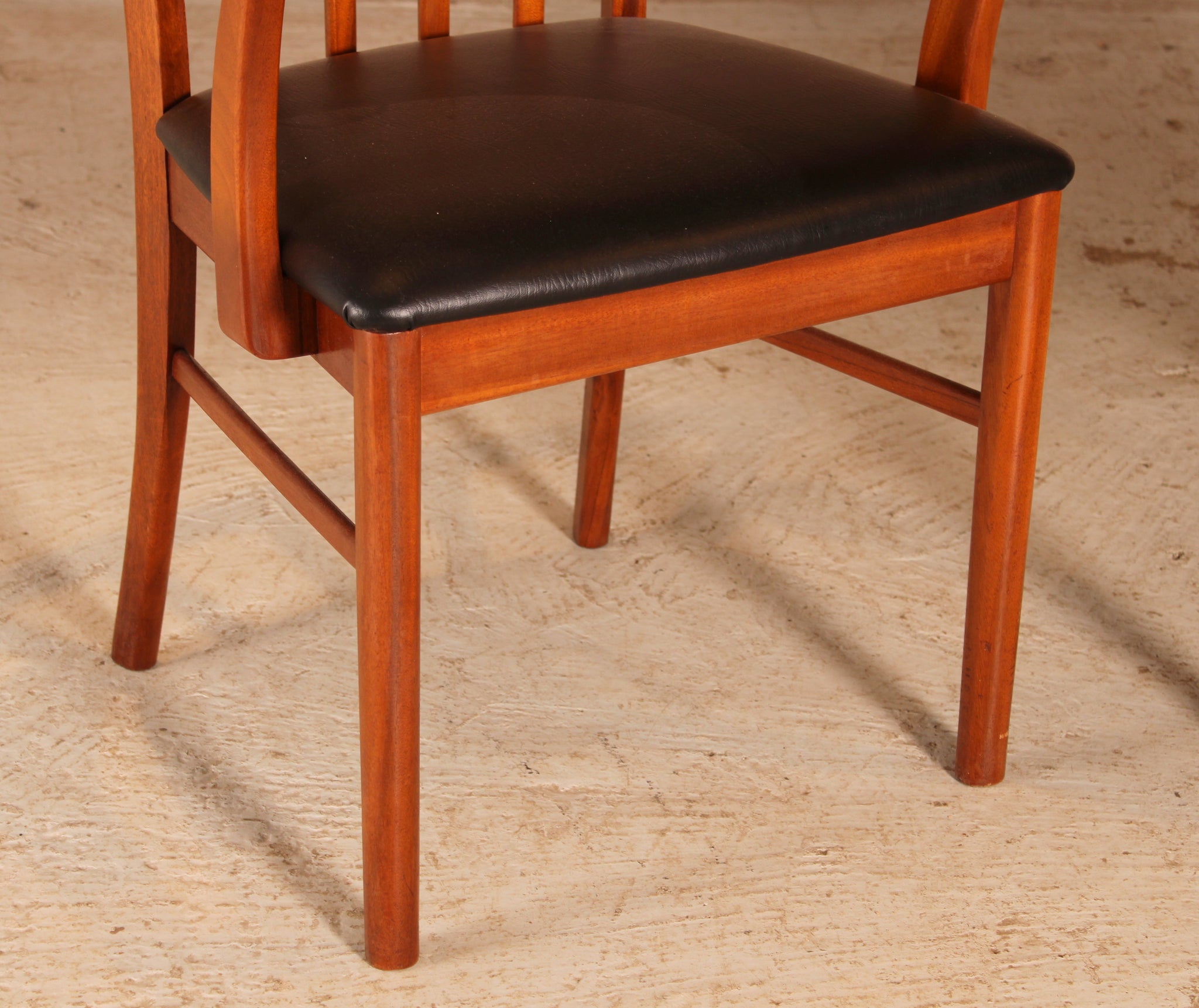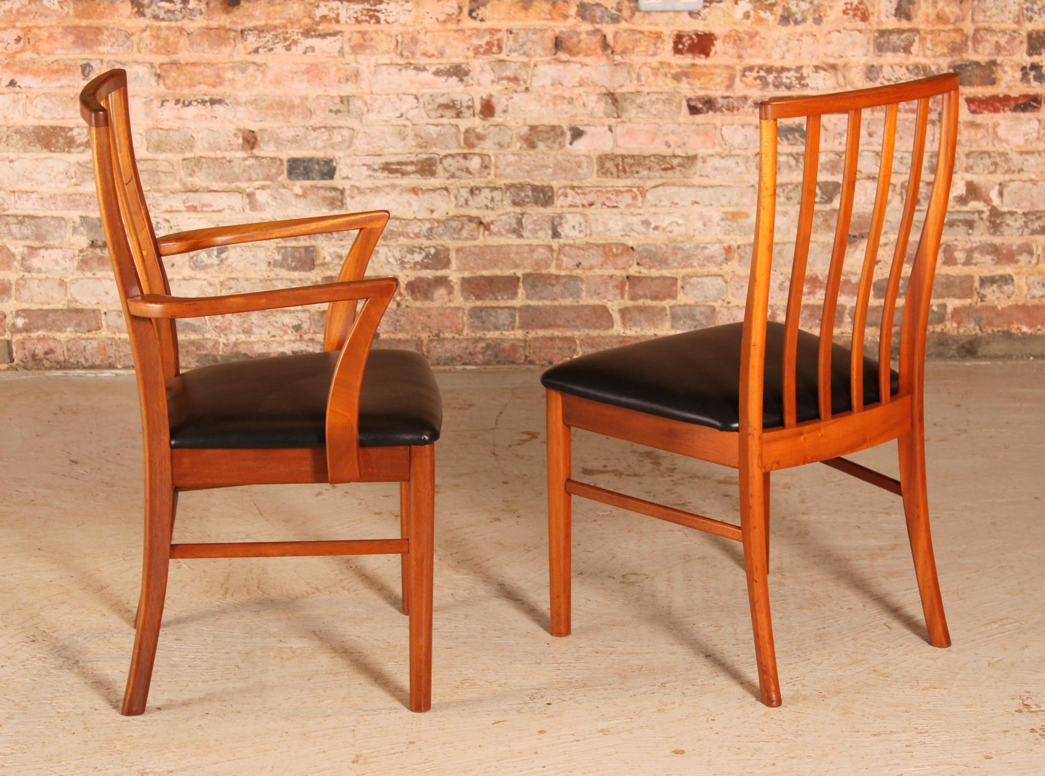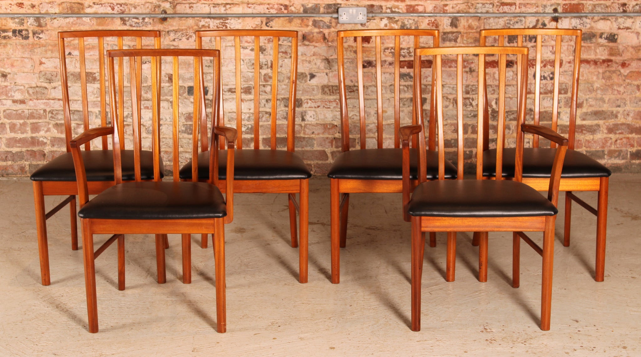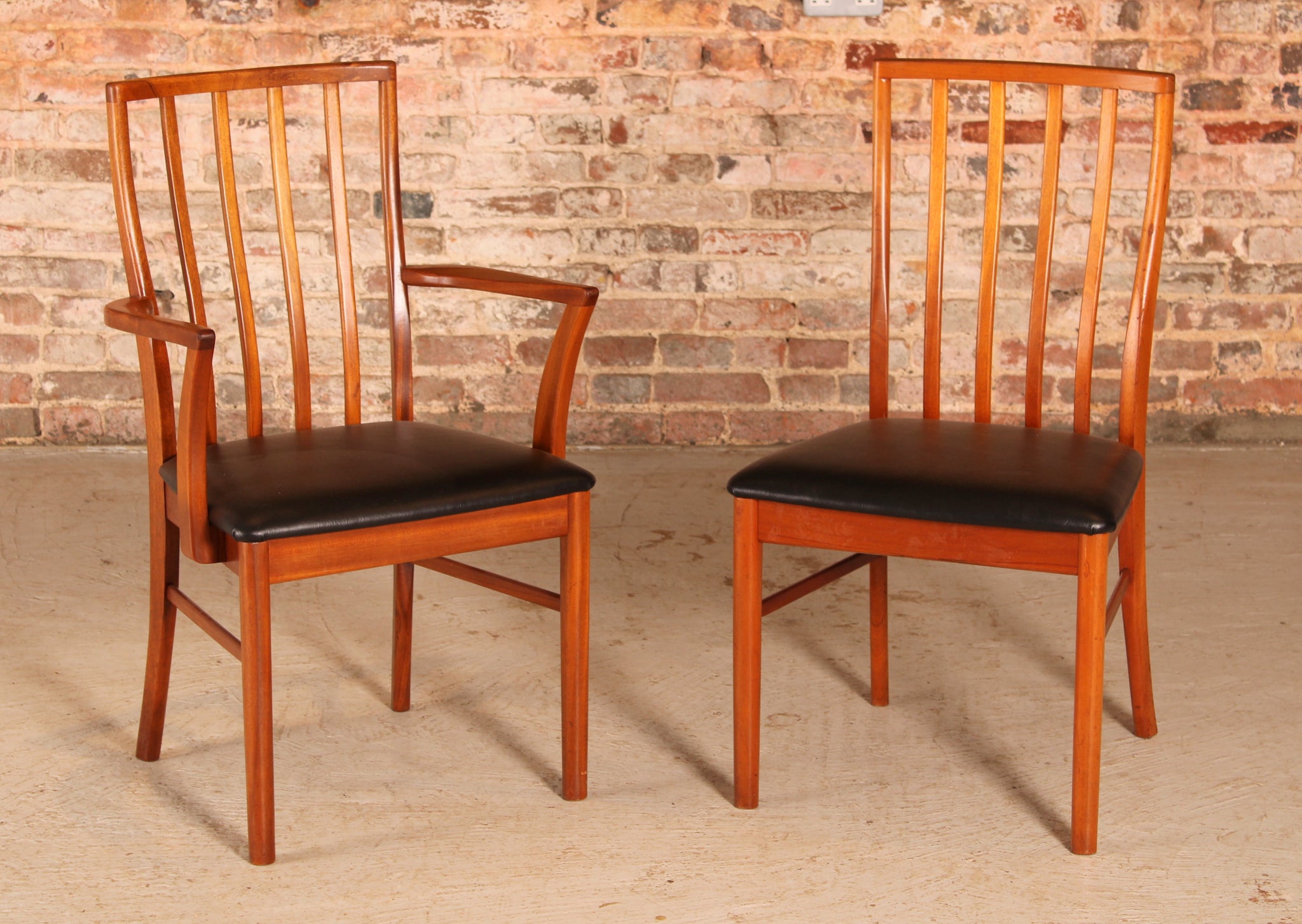 Set of 6 Mid Century teak dining chairs by Mcintosh, circa 1970s. 2 carvers and 4 side chairs. Newly reupholstered with premium black vinyl. Excellent condition.